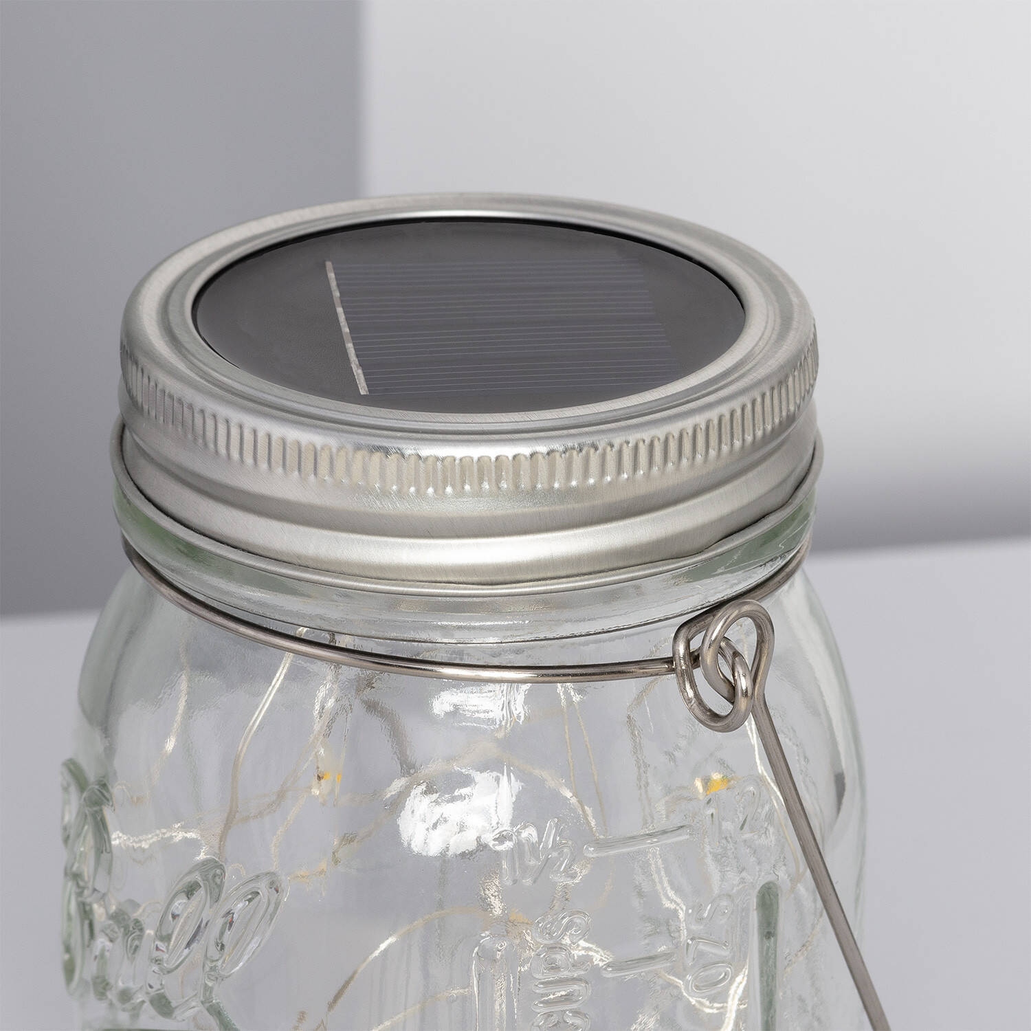 La Lampe LED Extérieure Bocal Solaire s'accroche facilement grâce à son anse métallique ou se pose simplement sur une table en tant que lanterne décorative. Le bocal mesure 130 mm de haut et 85 mm de diamètre, la guirlande intérieure fait 2 m, ce qui permet plusieurs options de suspension ou de disposition. Pour un éclairage optimal, placez le bocal de façon que le panneau solaire sur le couvercle soit exposé au soleil pendant la journée.
