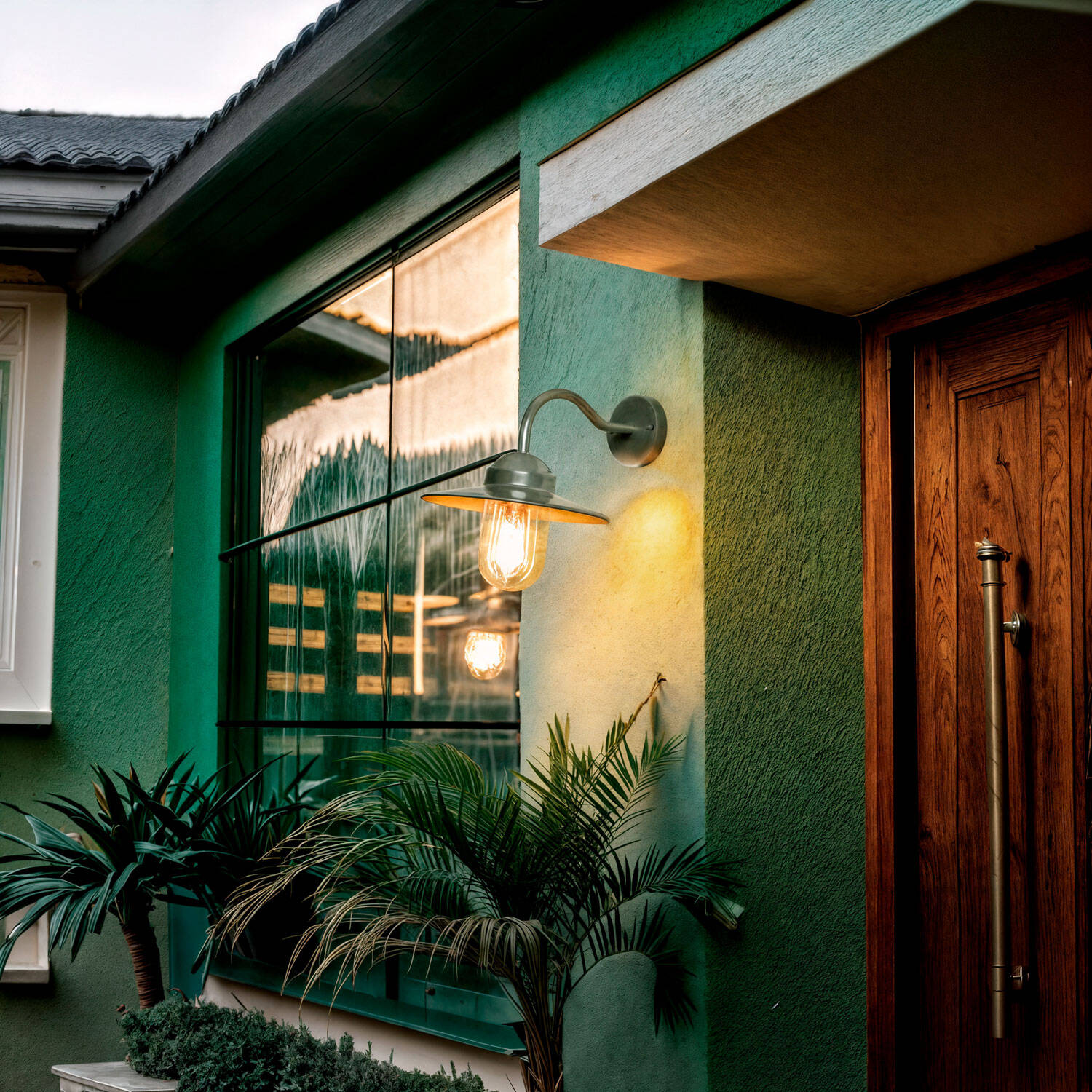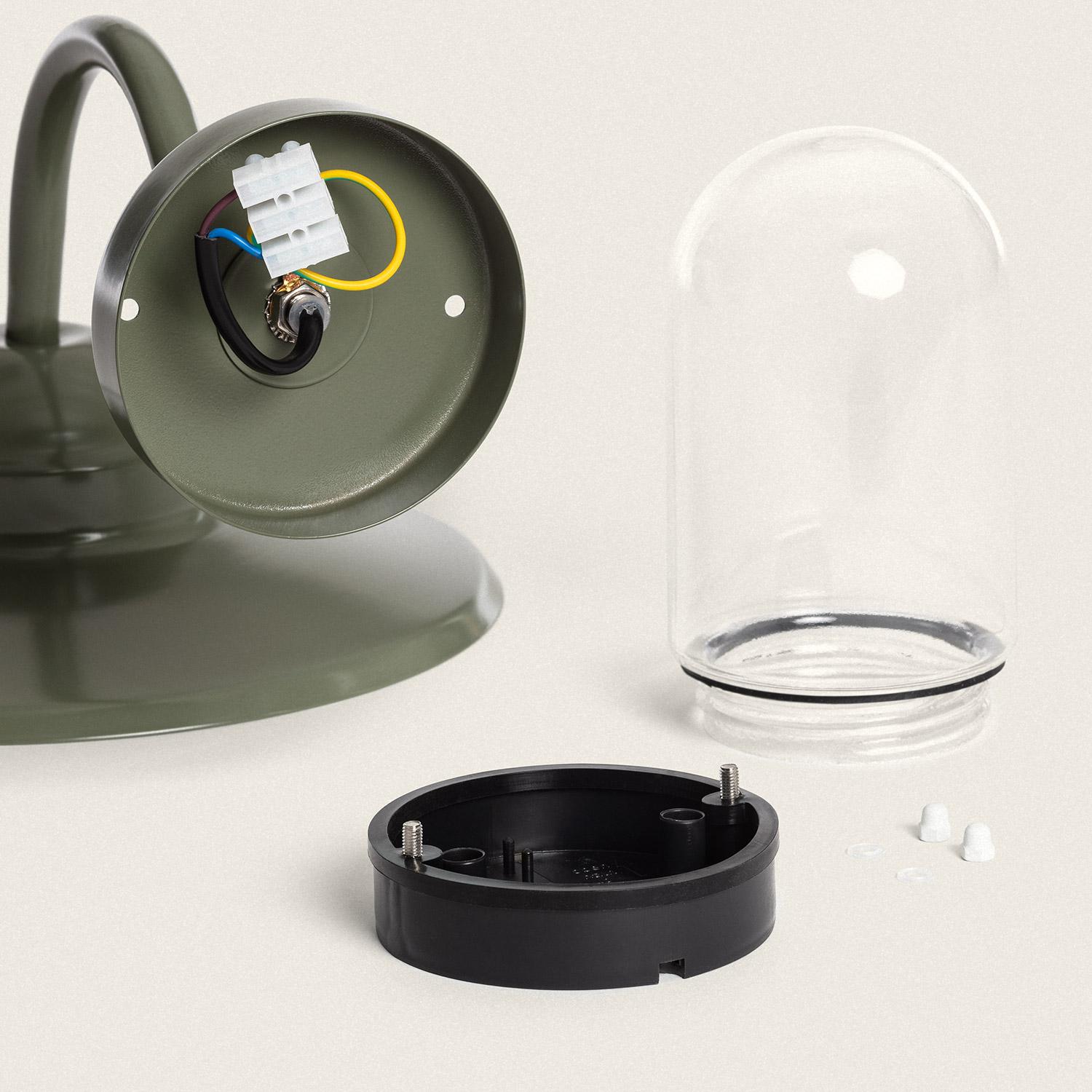 Le vert mat de la finition apporte une touche contemporaine et naturelle, s’harmonisant avec enduit, bois et végétation. La rosace discrète et l’arceau délicatement galbé créent un équilibre entre style rétro et modernité, pour une applique qui devient un véritable élément décoratif extérieur.