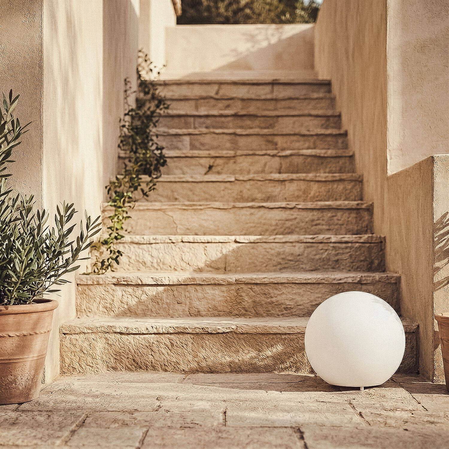 Son diffuseur blanc uniforme renforce son allure minimaliste et élégante, de jour comme de nuit. Même éteinte, cette lampe sphérique extérieure participe à la décoration avec discrétion et équilibre.