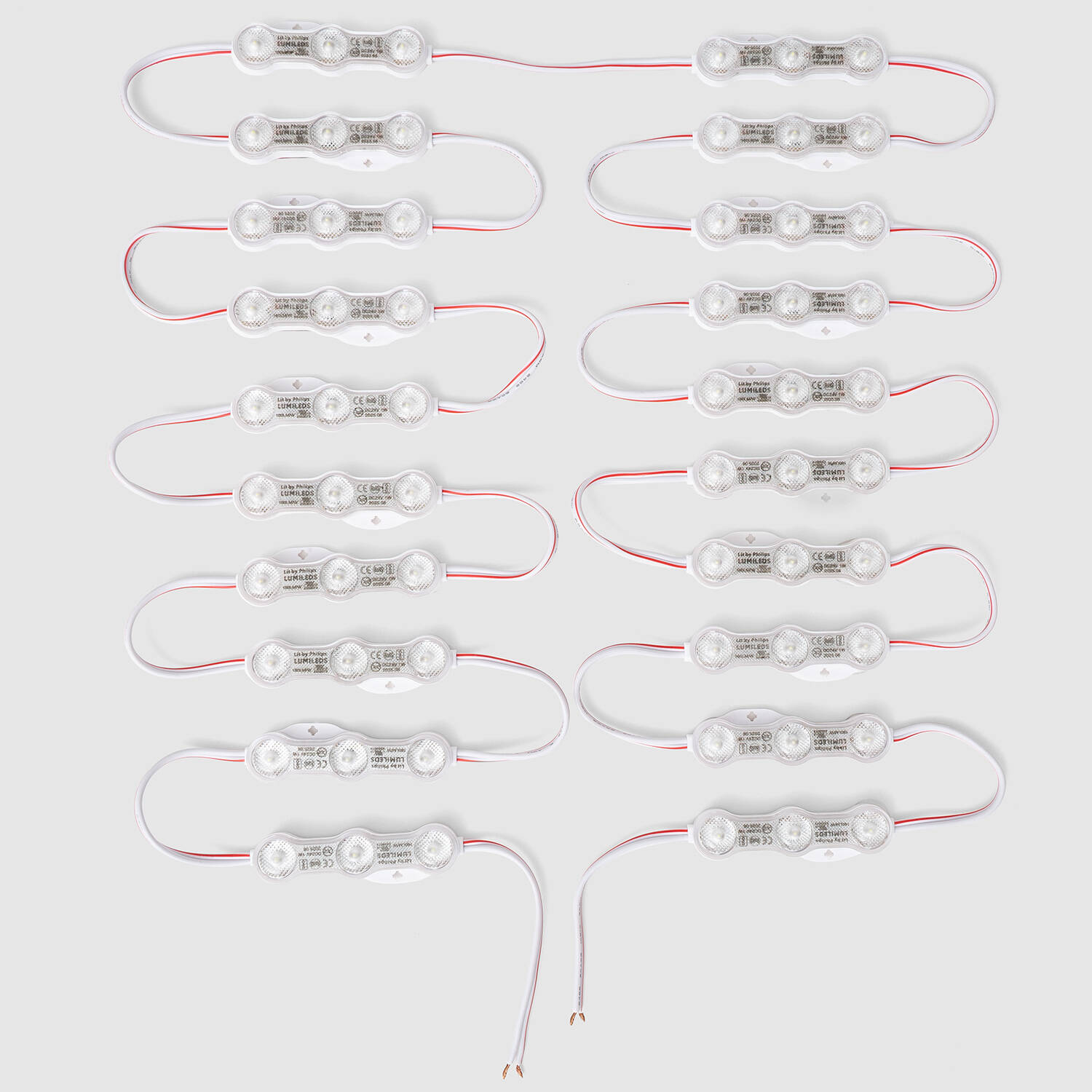 Il s'agit de modules individuels pré-câblés reliés par fils. Ils ne se coupent pas entre les LEDs comme un ruban classique, mais on peut séparer ou raccorder les modules en coupant ou en dénudant les fils entre modules et en réalisant des connexions étanches. Utilisez des connecteurs adaptés ou soudez puis protégez par manchons thermo ou silicone.