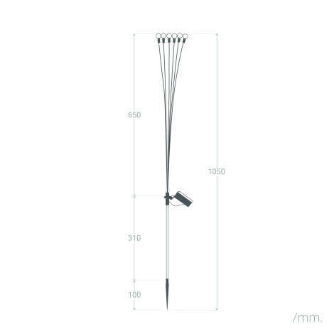 Le kit comprend deux piquets articulés et un panneau solaire séparé, pour positionner les éléments à la distance souhaitée. Les tiges souples et la hauteur d’un mètre permettent de composer facilement des effets ‘lucioles’ au milieu des plantations, sans altérer l’esthétique du jardin.