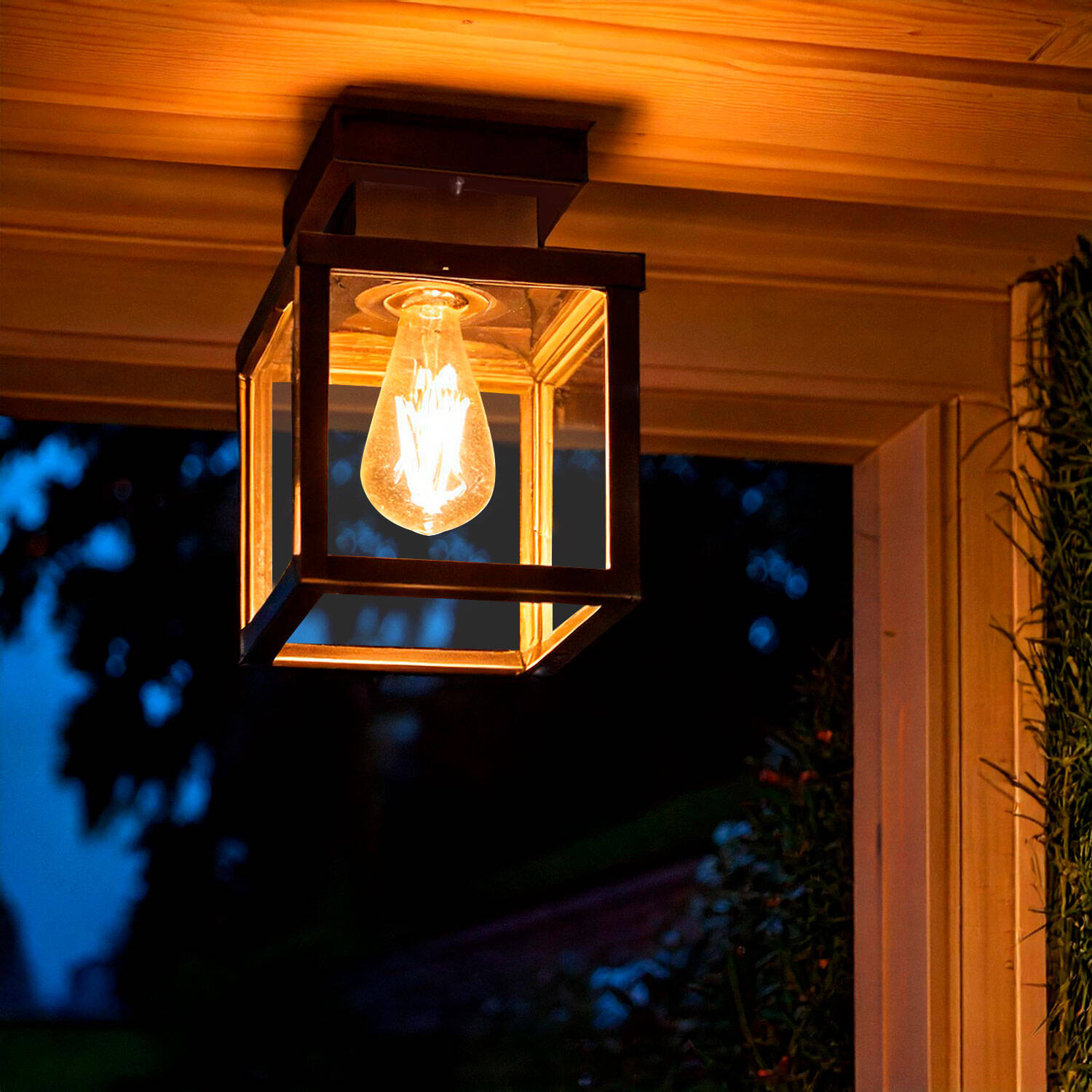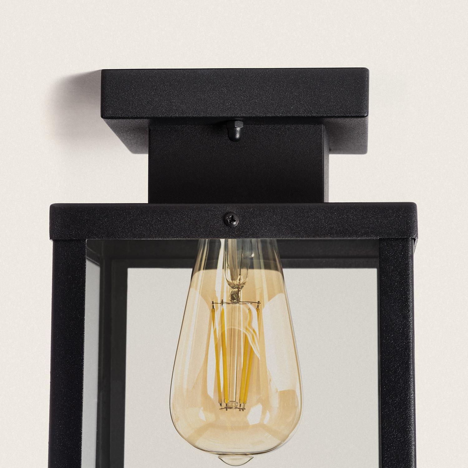 Le plafonnier extérieur Theia en acier noir séduit par son design lanterne aux lignes sobres et ses parois vitrées qui diffusent une lumière directe et élégante. Idéal sous un porche, une terrasse ou en intérieur, il se fixe en surface au plafond et fonctionne avec une ampoule E27 non incluse.