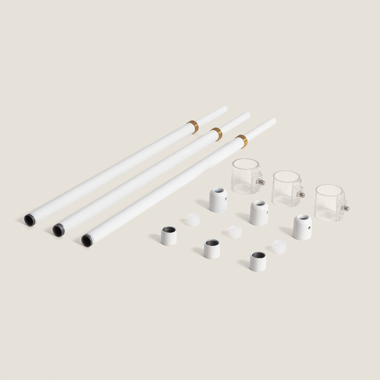 Le modèle fait 3 m de longueur avec un diamètre de 24 mm et se présente en blanc. Son design orientable et flexible permet de créer des courbes ou des configurations personnalisées. Les photos montrent les supports et accessoires de fixation fournis pour faciliter la pose en surface.