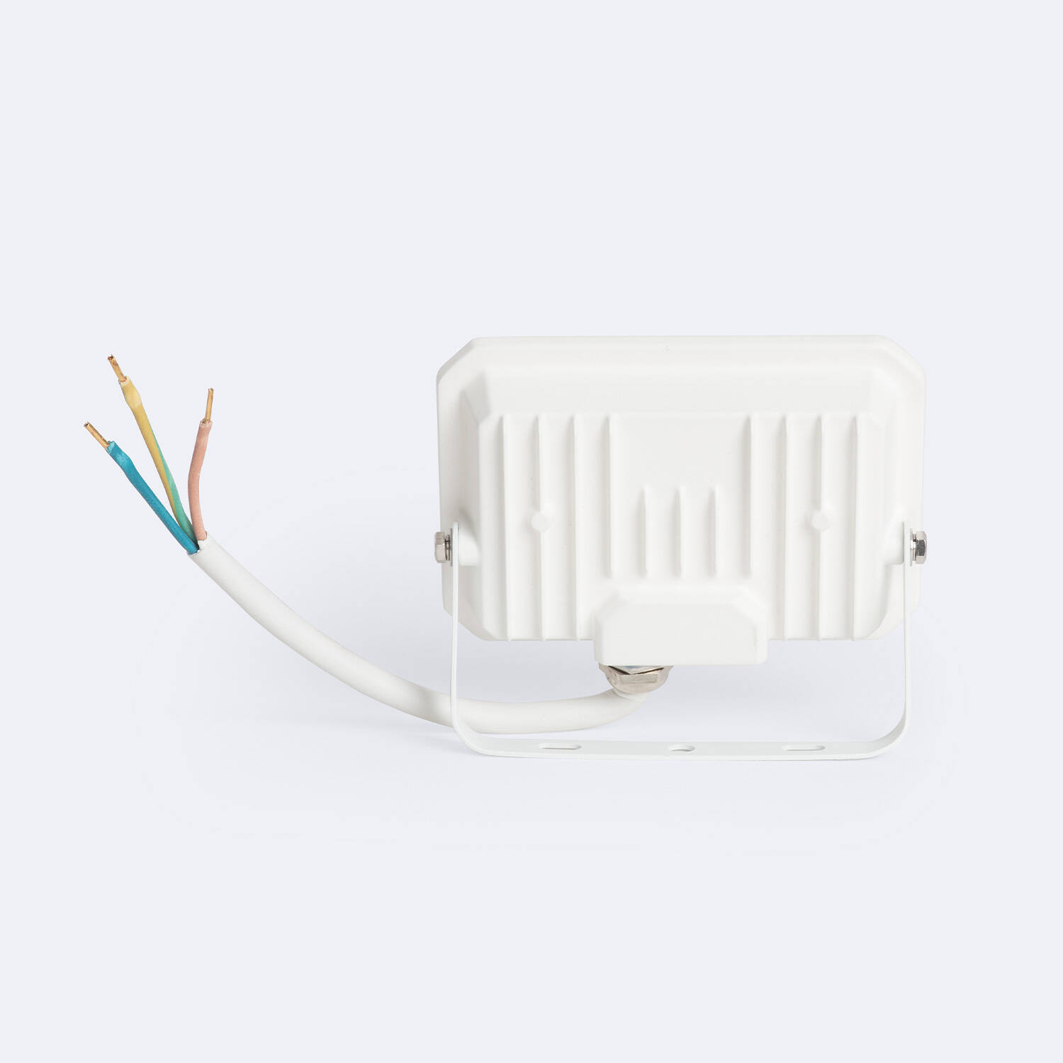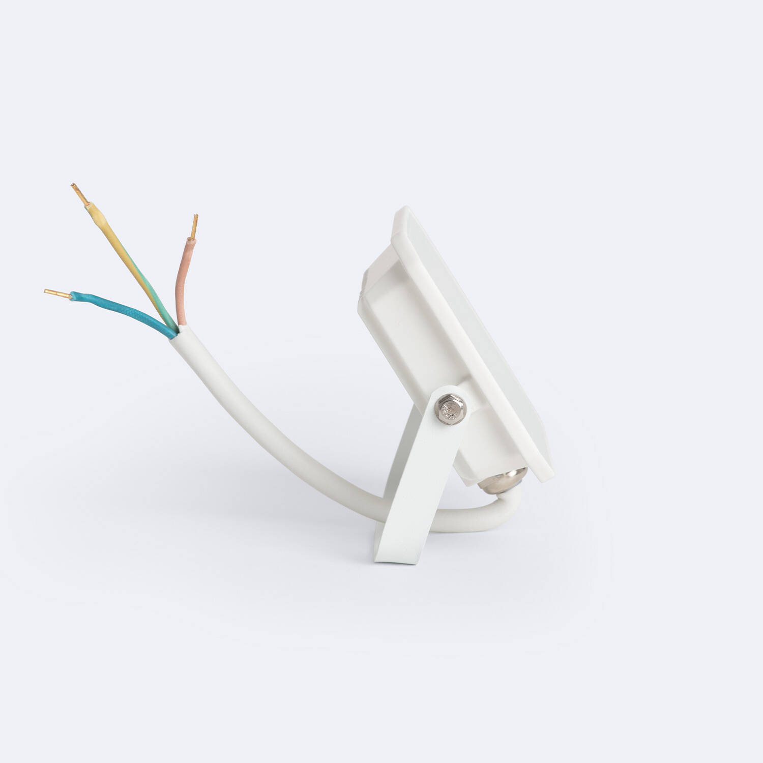 Le projecteur se fixe en surface à l'aide de l'étrier fourni et peut être installé sur un mur ou un muret. Il se branche sur une alimentation 220‑240V AC via le câble de 50 cm visible sur les images. Coupez l'alimentation avant toute intervention et faites réaliser le raccordement par un électricien qualifié en respectant la mise à la terre obligatoire pour la classe I.