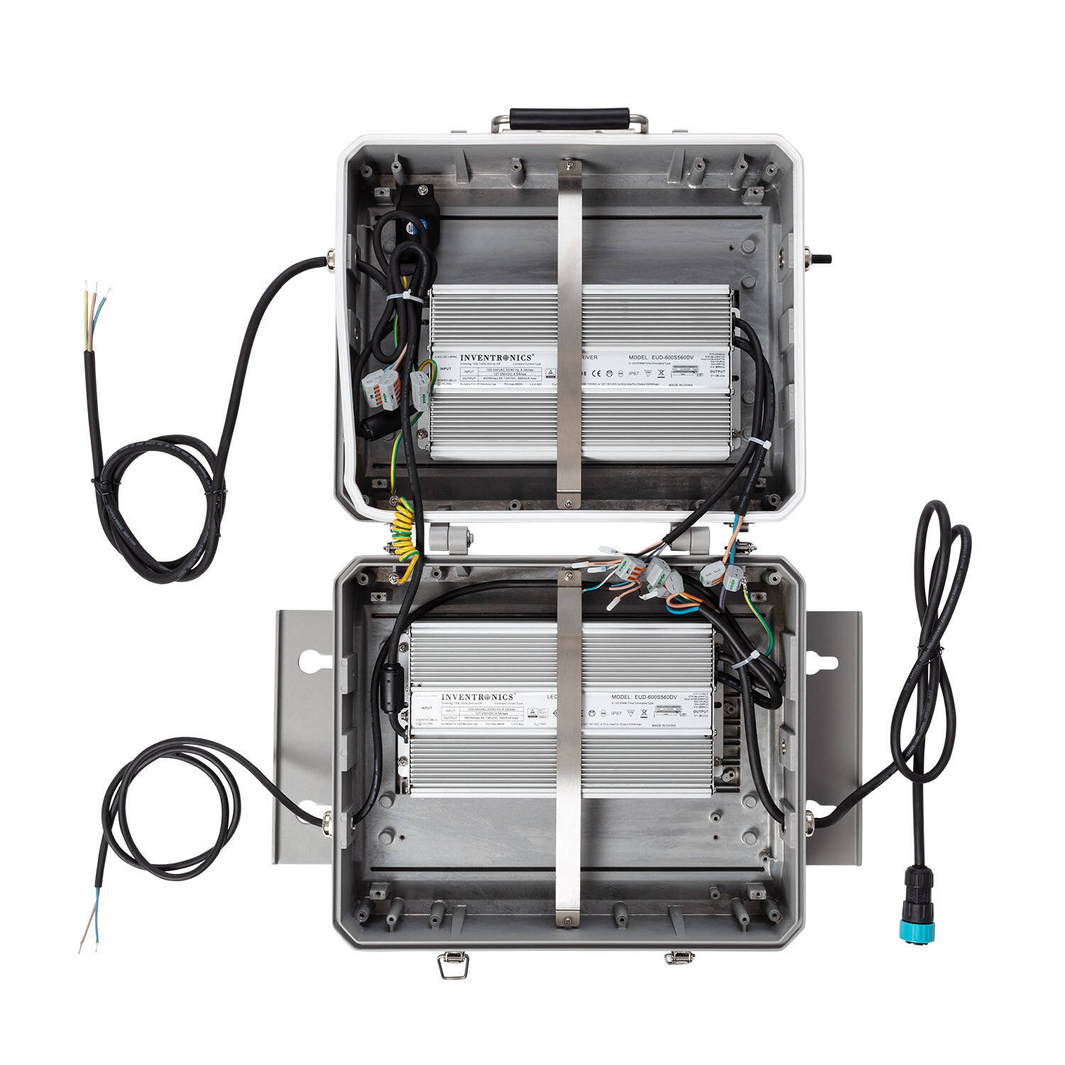 La gradation 0‑10V permet un pilotage fin de l’intensité pour s’adapter aux besoins d’événements ou économies d’énergie. Le driver INVENTRONICS intégré assure protections contre courts‑circuits et surtensions, tout en maintenant un facteur de puissance élevé et une compatibilité 50‑60 Hz.