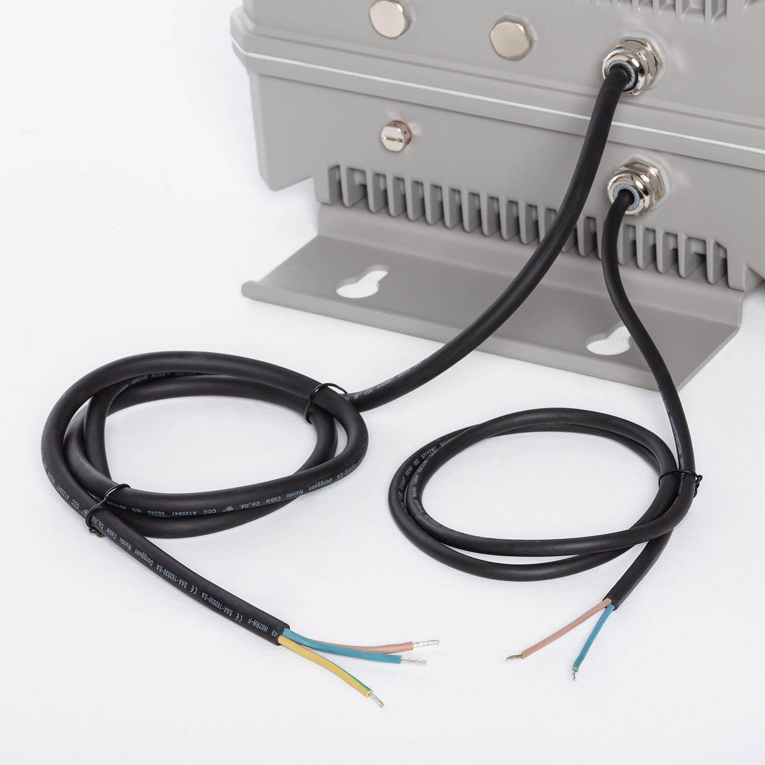 L'appareil accepte une tension nominale de 100 V à 277 V et fonctionne en 110 V AC ou 220-240 V AC avec une fréquence 50-60 Hz. Le boîtier driver séparé et les câbles visibles sur les images incluent un connecteur étanche pour faciliter le raccordement. Toujours couper l'alimentation avant toute intervention et confier le câblage à un électricien.