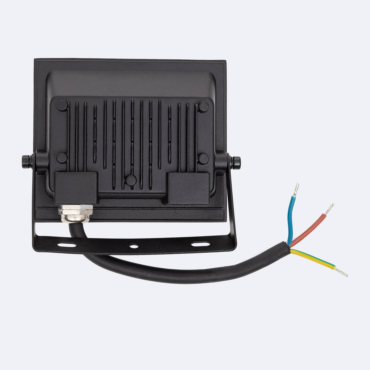 Le projecteur se monte en surface et dispose d'un étrier réglable visible sur les photos. Il peut être fixé au mur, sur un poteau ou sur un muret à l'aide de l'étrier. Utilisez des fixations adaptées au matériau de votre support et serrez les vis d'ajustement pour orienter le faisceau à l'angle souhaité.