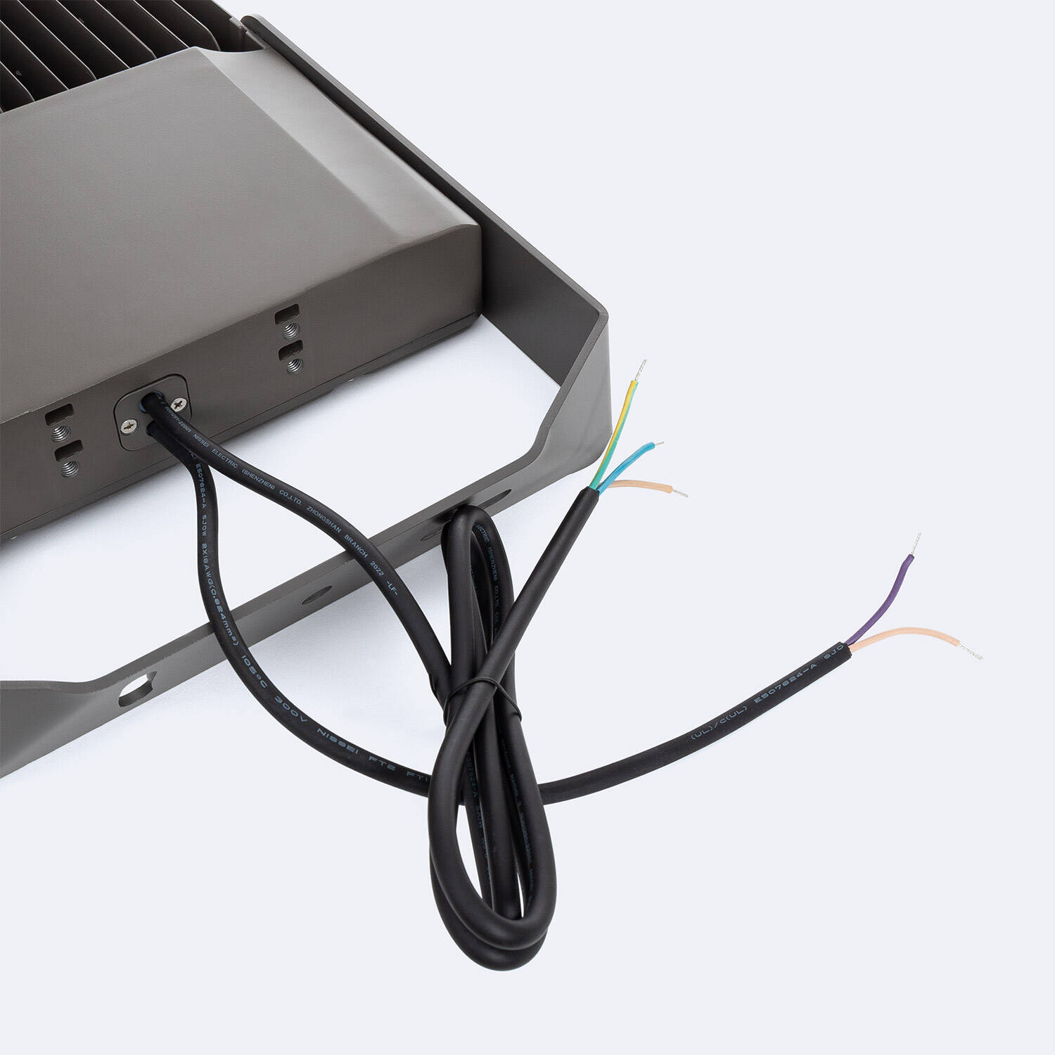 Le projecteur fonctionne sur une alimentation 220‑240 V AC avec tension nominale 100‑277 V et fréquence 50‑60 Hz. Il est de classe d'isolation I et intègre une protection contre les surtensions de 10 kV. Une mise à la terre correcte est requise lors du raccordement, confiez le branchement à un professionnel pour garantir la sécurité et la conformité.