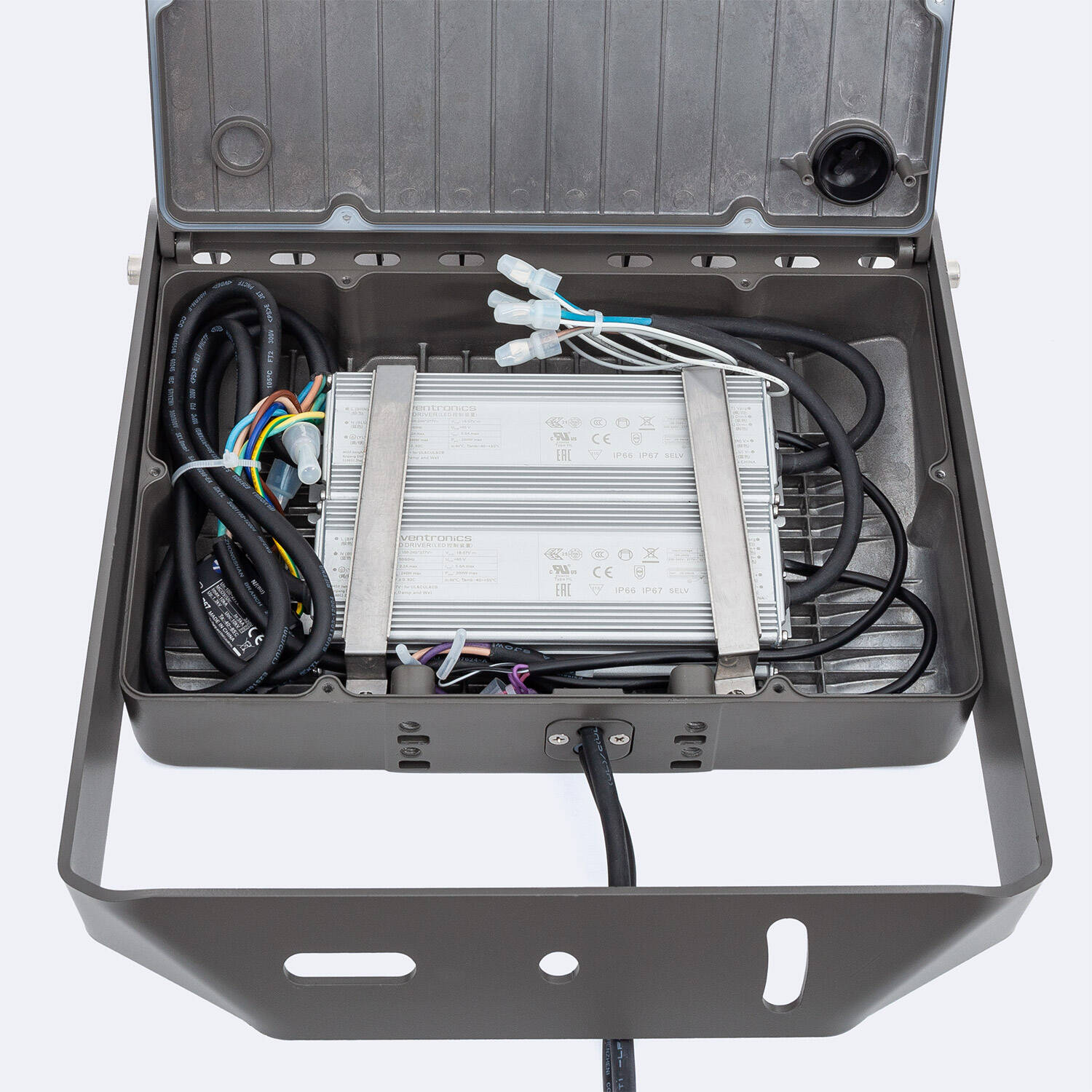Le boîtier en aluminium intègre des dissipateurs optimisés qui favorisent un refroidissement efficace, préservant la performance des LED LUMILEDS et prolongeant leur durée de vie. Un facteur de puissance élevé et une gestion thermique soignée assurent rendement constant et stabilité en continu.