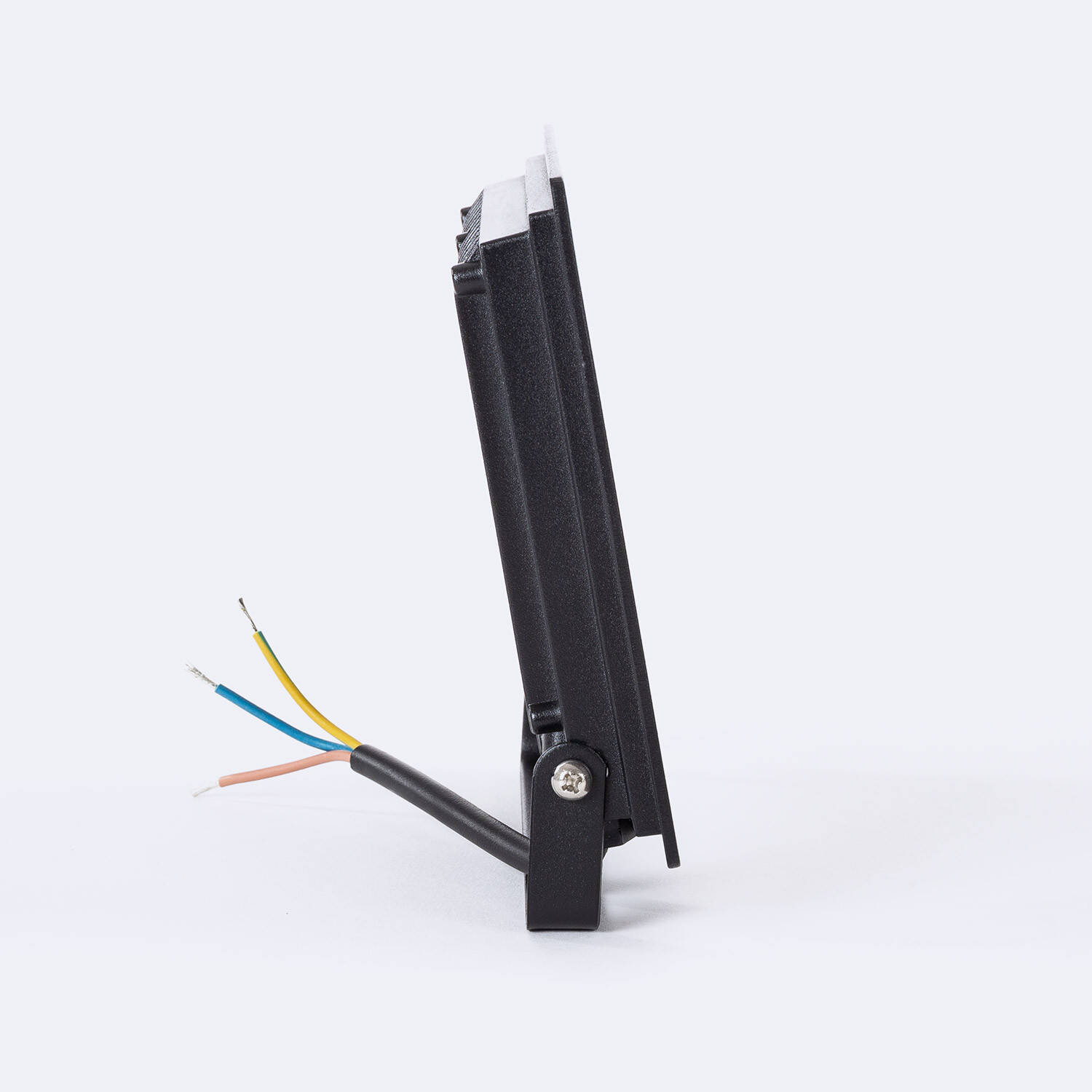 Le projecteur est prévu pour une installation en surface avec support muret et étrier visible sur les photos. Coupez l'alimentation avant toute intervention et fixez l'étrier sur un support solide avec chevilles adaptées. Le câble d'alimentation fourni mesure 150 mm, le raccordement se fait sur 220 240V AC. Pour garantir la conformité et la sécurité électrique, faites effectuer le branchement par un électricien qualifié.