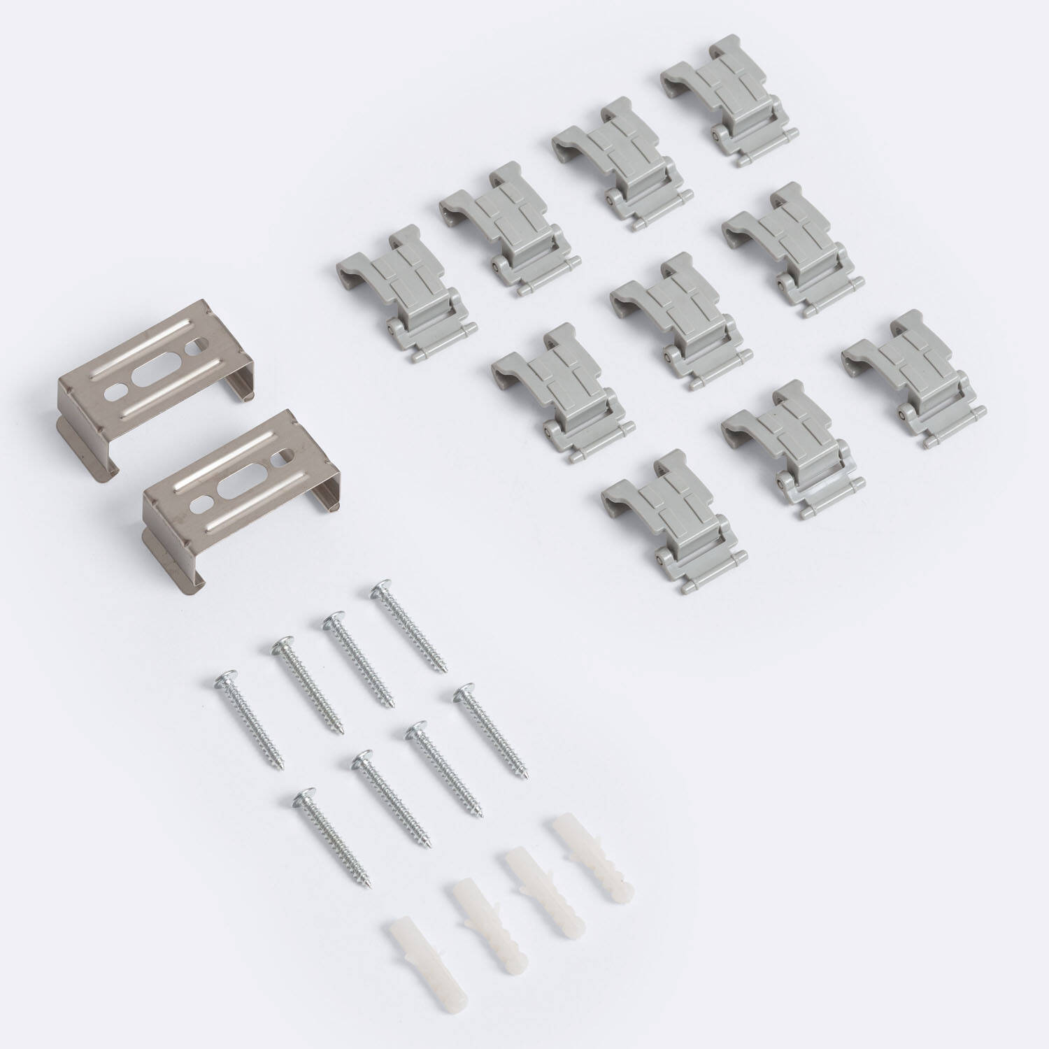 L'installation se fait en fixation surface à l'aide des clips et supports de montage visibles sur les photos. Coupez l'alimentation, fixez les supports au plafond ou mur avec des chevilles adaptées, clipsez la réglette et raccordez-la au réseau 220-240V AC. Pour un raccordement conforme et sécurisé, faites appel à un électricien qualifié.