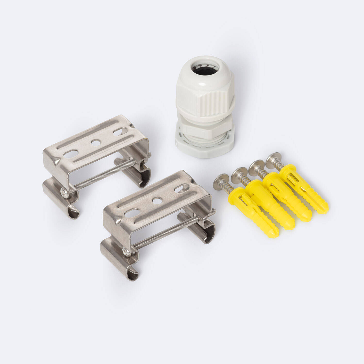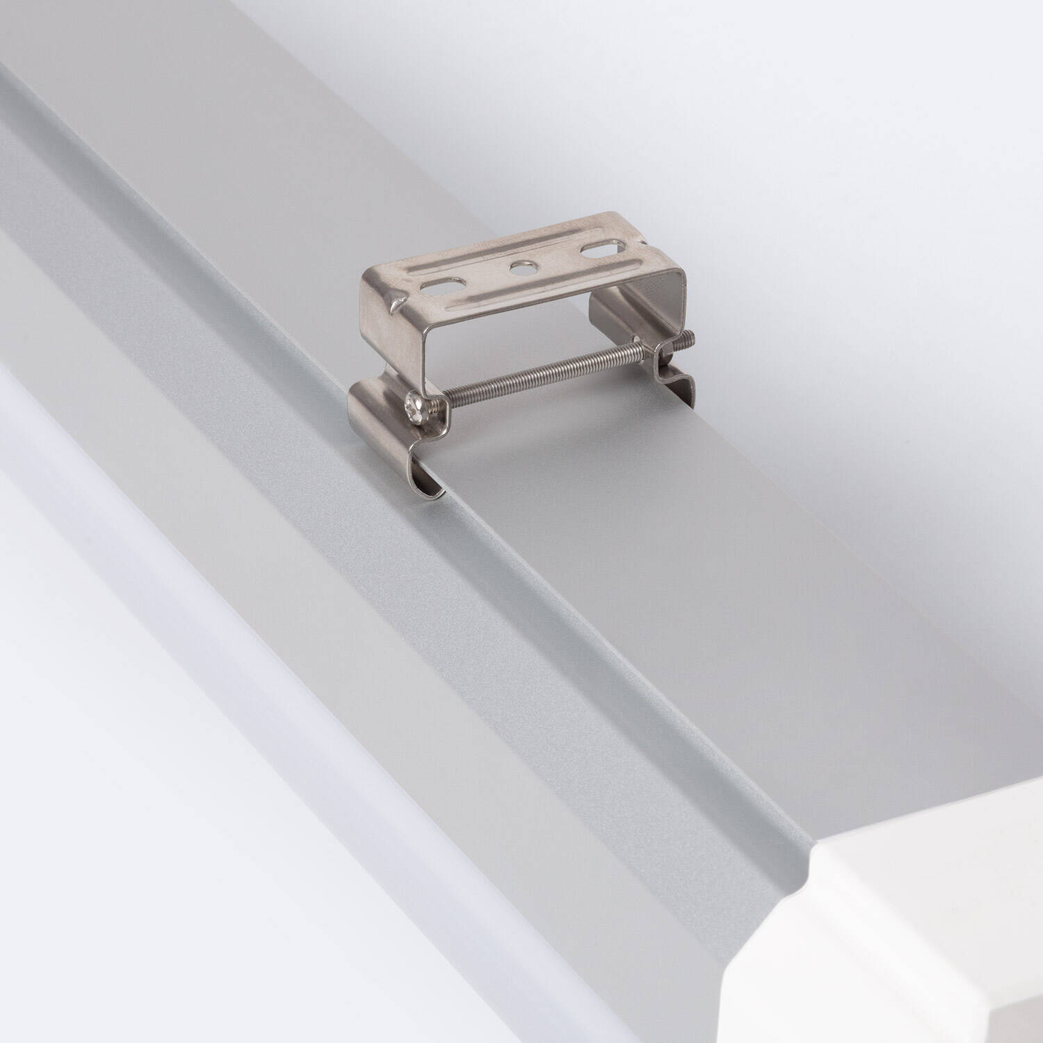 La réglette se fixe en surface à l'aide des clips métalliques fournis et des chevilles et vis visibles sur les photos. Coupez l'alimentation avant toute intervention. Le bornier à l'extrémité permet un raccordement propre et l'entrée étanche assure l'étanchéité IP65 après installation. Pour une installation conforme et sécurisée préférez un électricien qualifié.