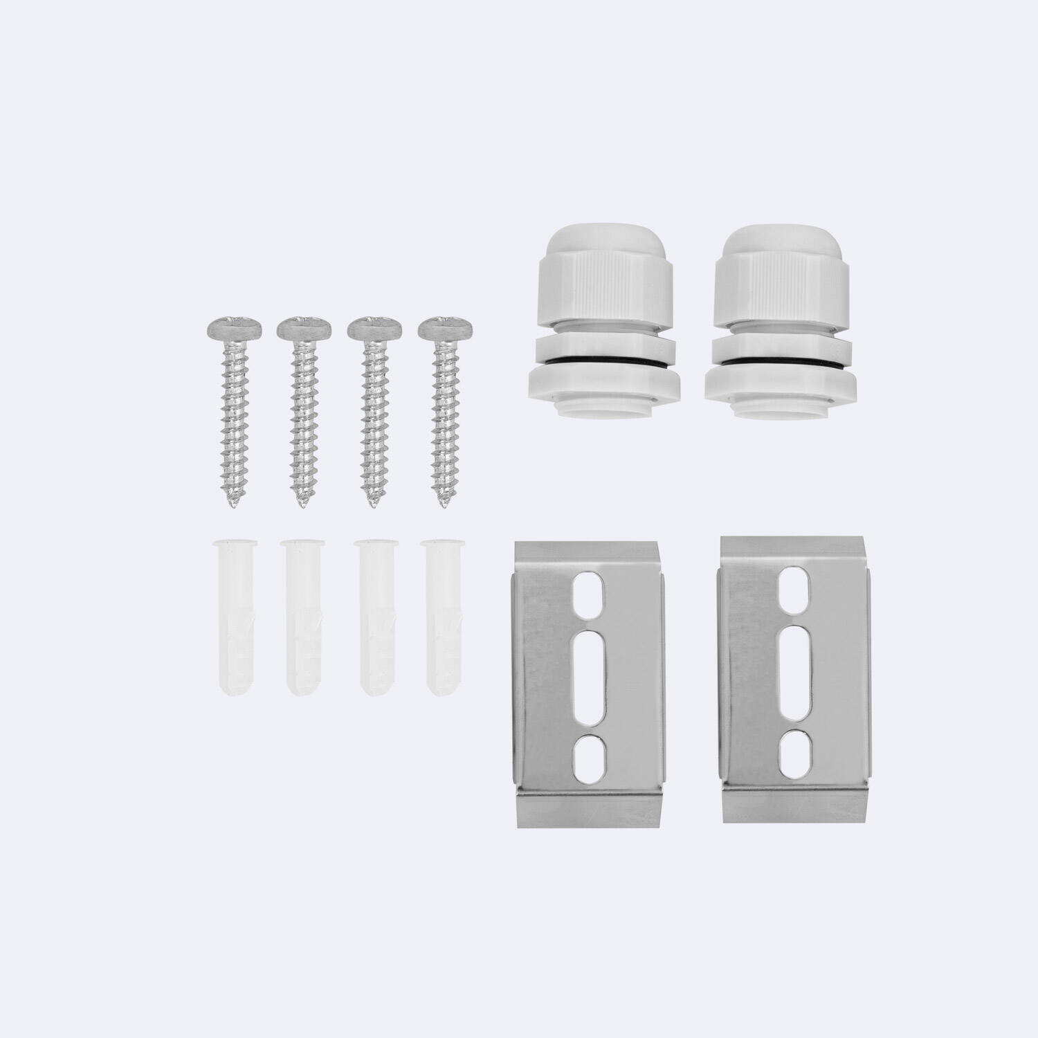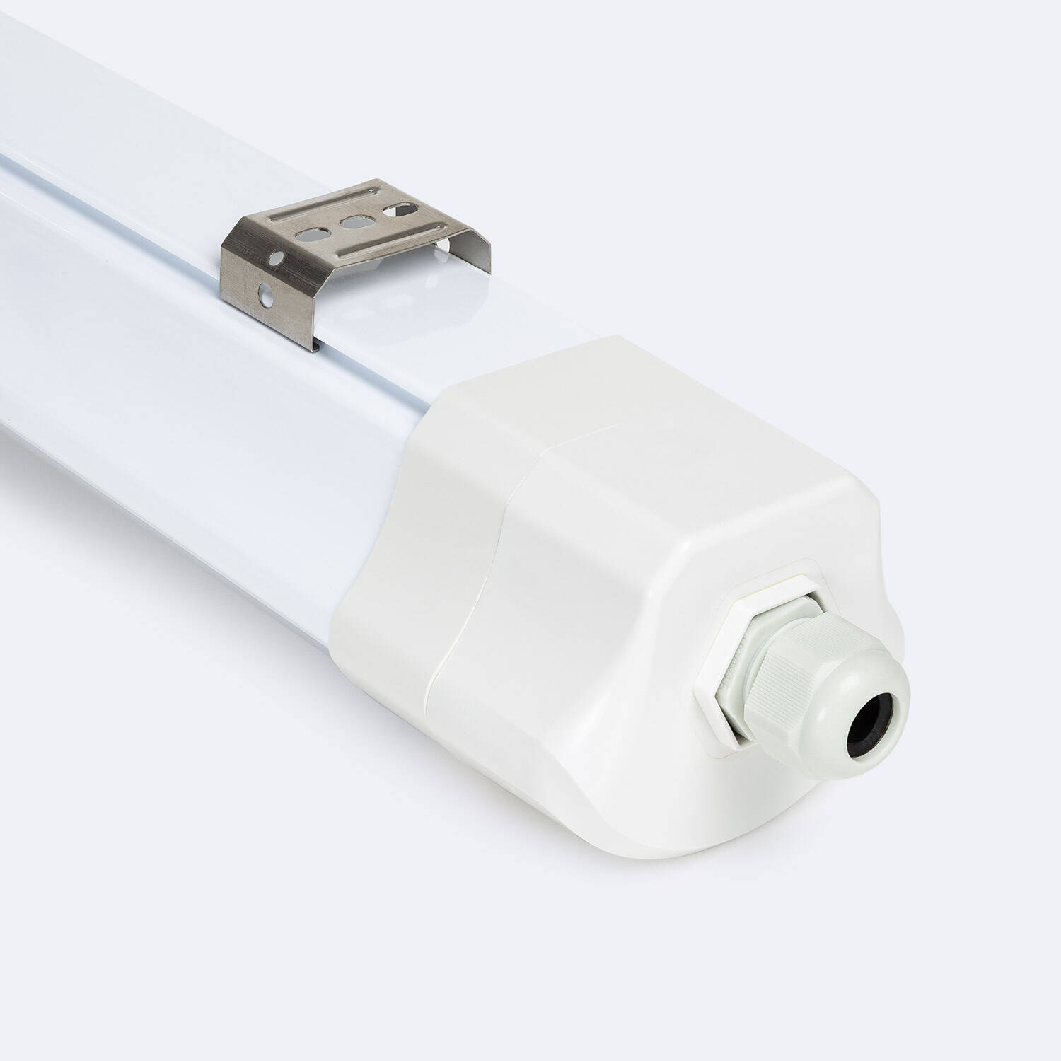 La réglette s'installe en pose surface à l'aide des clips de fixation et vis fournis visibles sur les photos. Coupez l'alimentation avant le branchement et utilisez les presse-étoupes fournis pour garantir l'étanchéité IP66 lors du passage des câbles. Pour une installation électrique conforme et la mise en chaîne de plusieurs réglettes, nous recommandons un électricien qualifié.