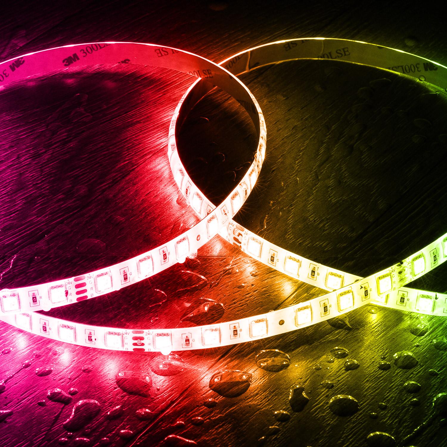 Les LED RGB permettent une palette chromatique riche, idéale pour créer ambiances dynamiques ou discrètes. Pilotable par un contrôleur RGB adapté, le bandeau restitue des couleurs saturées grâce aux puces SMD5050, offrant un éclairage homogène sur toute la longueur sans perte visible de teinte.