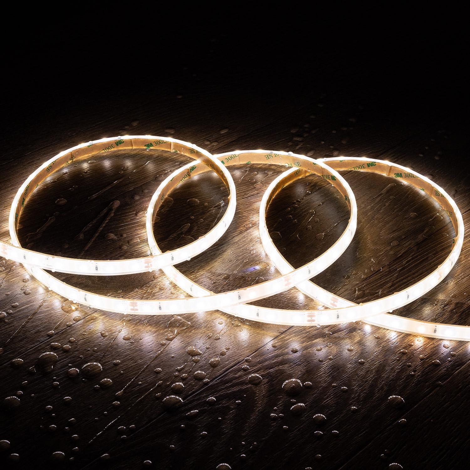 Grâce à son encapsulage silicone et à une protection IP68, le ruban résiste aux intempéries et peut être installé en milieu humide ou immergé temporairement. Pour préserver l’étanchéité, les connexions doivent être protégées et les rubans ne doivent jamais être alimentés enroulés afin d’éviter la surchauffe.