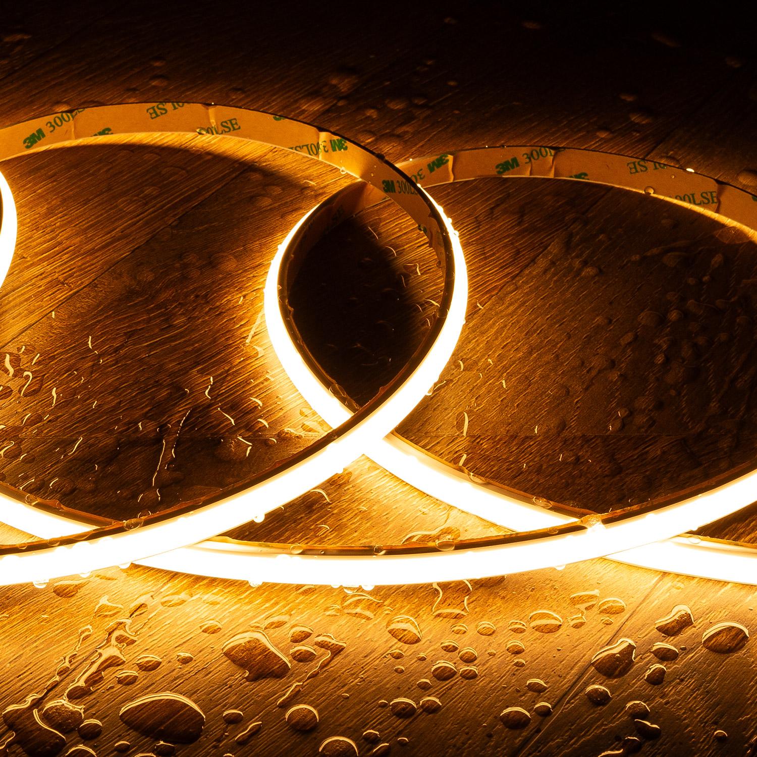 Ce ruban LED extérieur 24V WCOB de 5 m diffuse une ligne lumineuse continue en blanc chaud 2700K, idéale pour souligner façades, pergolas ou aménagements décoratifs. Sa finition silicone IP65, sa technologie FreeCut et son excellent CRI 90 assurent une intégration flexible, durable et soignée en intérieur comme en extérieur.
