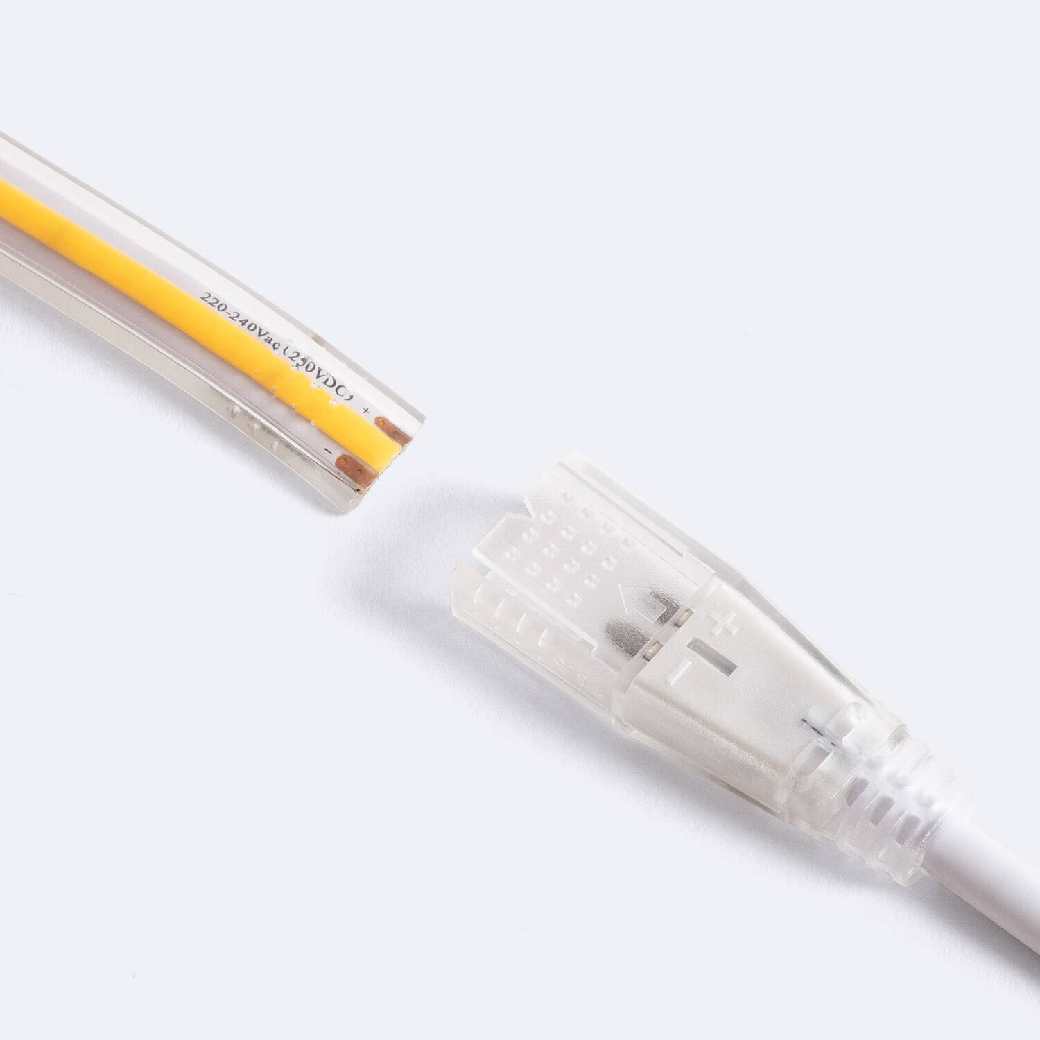 Ce ruban LED 220-240V se connecte directement au réseau via le connecteur redresseur visible sur les images. Il est fourni avec un câble d'alimentation permettant un branchement apparent sur prise ou tableau suivant l'installation. Pour toute intervention sur l'alimentation ou le remplacement du driver, faites appel à un électricien qualifié afin de respecter la sécurité et la conformité.