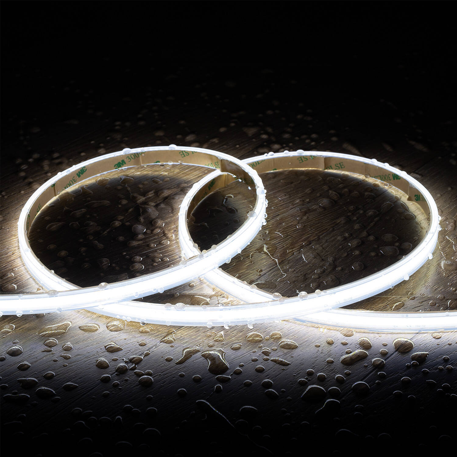 Ce ruban LED extérieur 220V COB dimmable diffuse une ligne lumineuse continue en blanc froid 5000K, sans points visibles. Son auto-redressement simplifie l’installation directe au réseau, tandis que son revêtement silicone IP65 et sa coupe tous les 25 cm en font une solution fiable et flexible pour éclairage extérieur et intérieur.