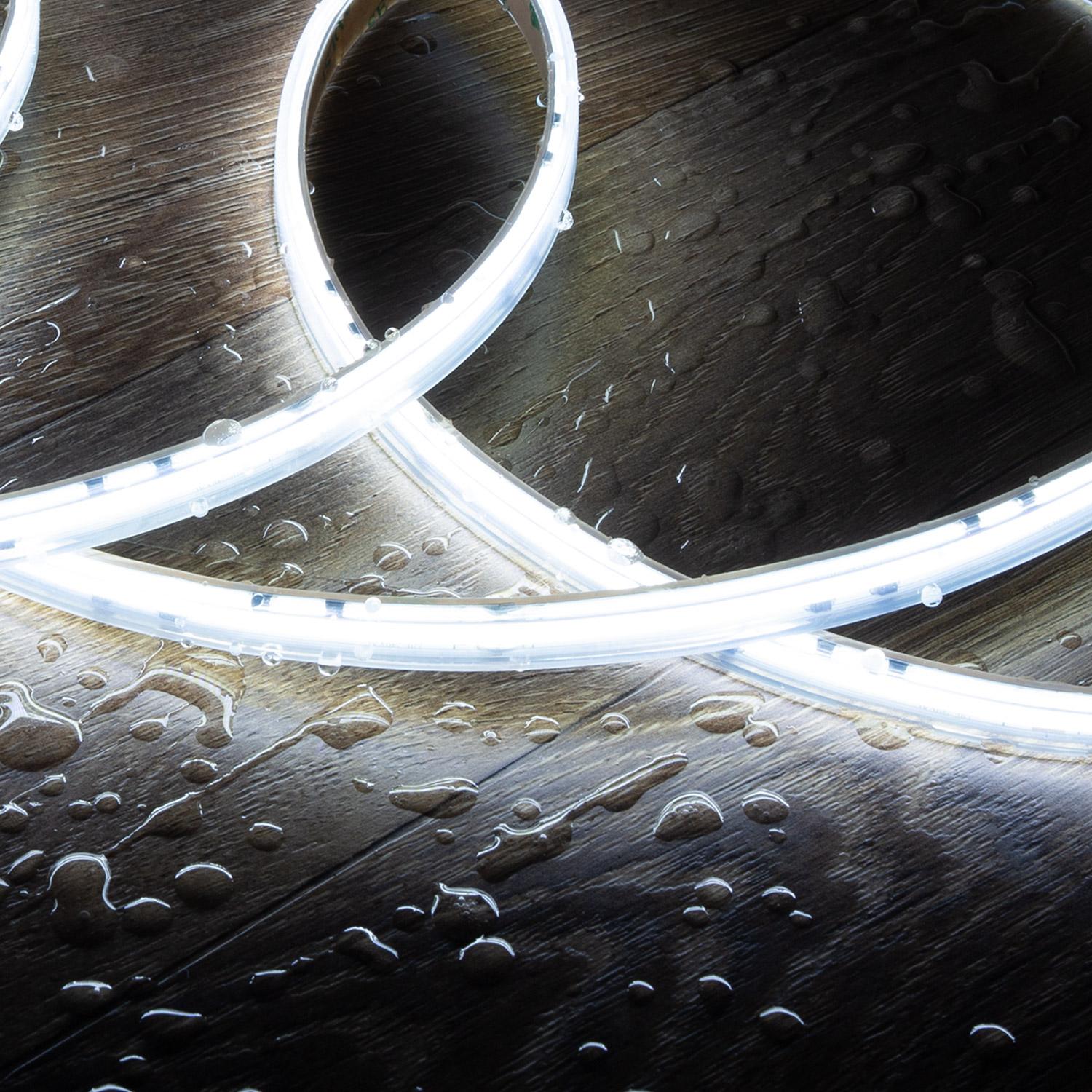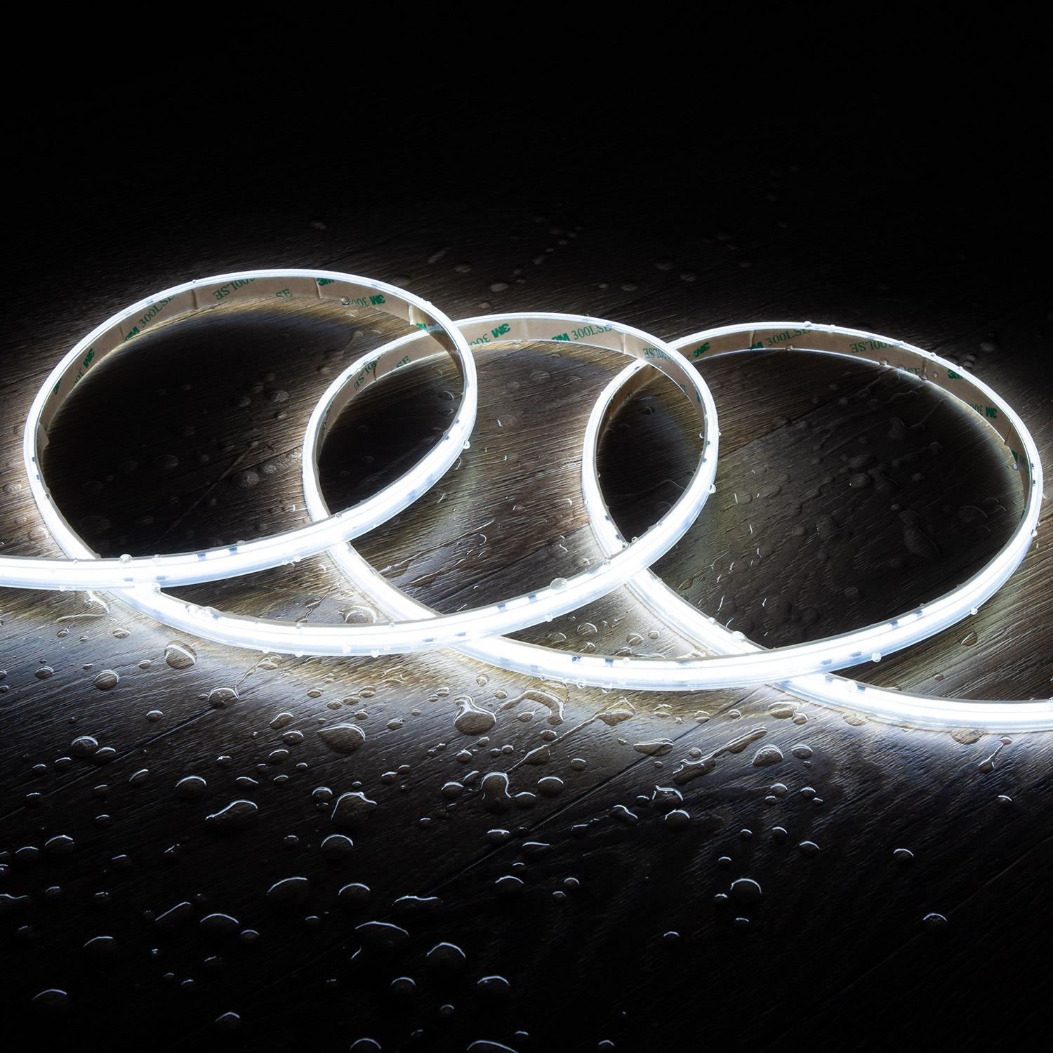 Ce ruban LED extérieur 220V COB dimmable en bobine de 50 m diffuse une ligne lumineuse continue en blanc froid 6000K, idéale pour baliser, souligner une façade ou éclairer une terrasse. Flexible, auto-redressé, recoupable tous les 50 cm et protégé IP65, il s’utilise en intérieur comme en extérieur.