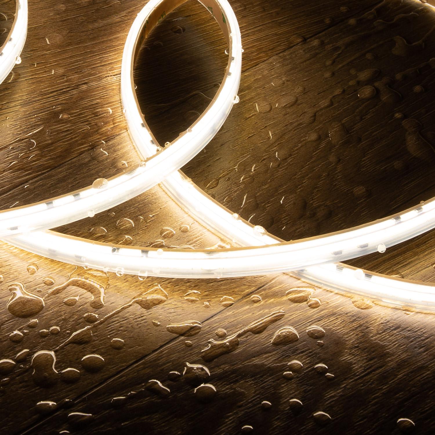 Ce ruban LED extérieur 220V COB dimmable en bobine de 50 m diffuse une lumière blanc neutre 4000K homogène et confortable, sans points visibles. Auto-redressé, il se raccorde directement au réseau et convient aussi bien aux façades, terrasses et vitrines qu’aux projets intérieurs, avec protection IP65 et découpe tous les 50 cm.