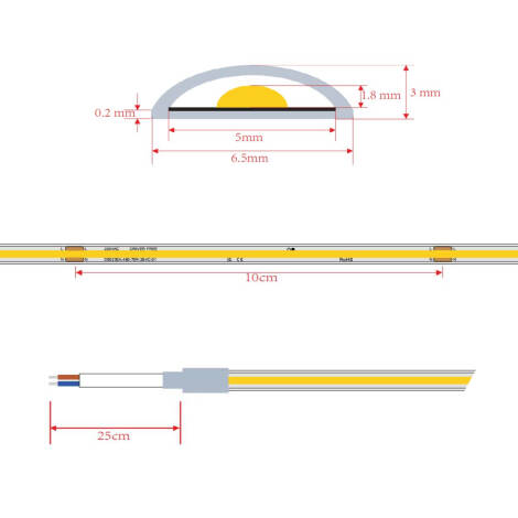 Ruban LED Dimmable 220V COB Auto-redressement 480 LED/m BOBINE 20m 12W/m 900lm/m Super Étroite Largeur 6.5mm Coupe 10cm IP65 Blanc chaud 2700K