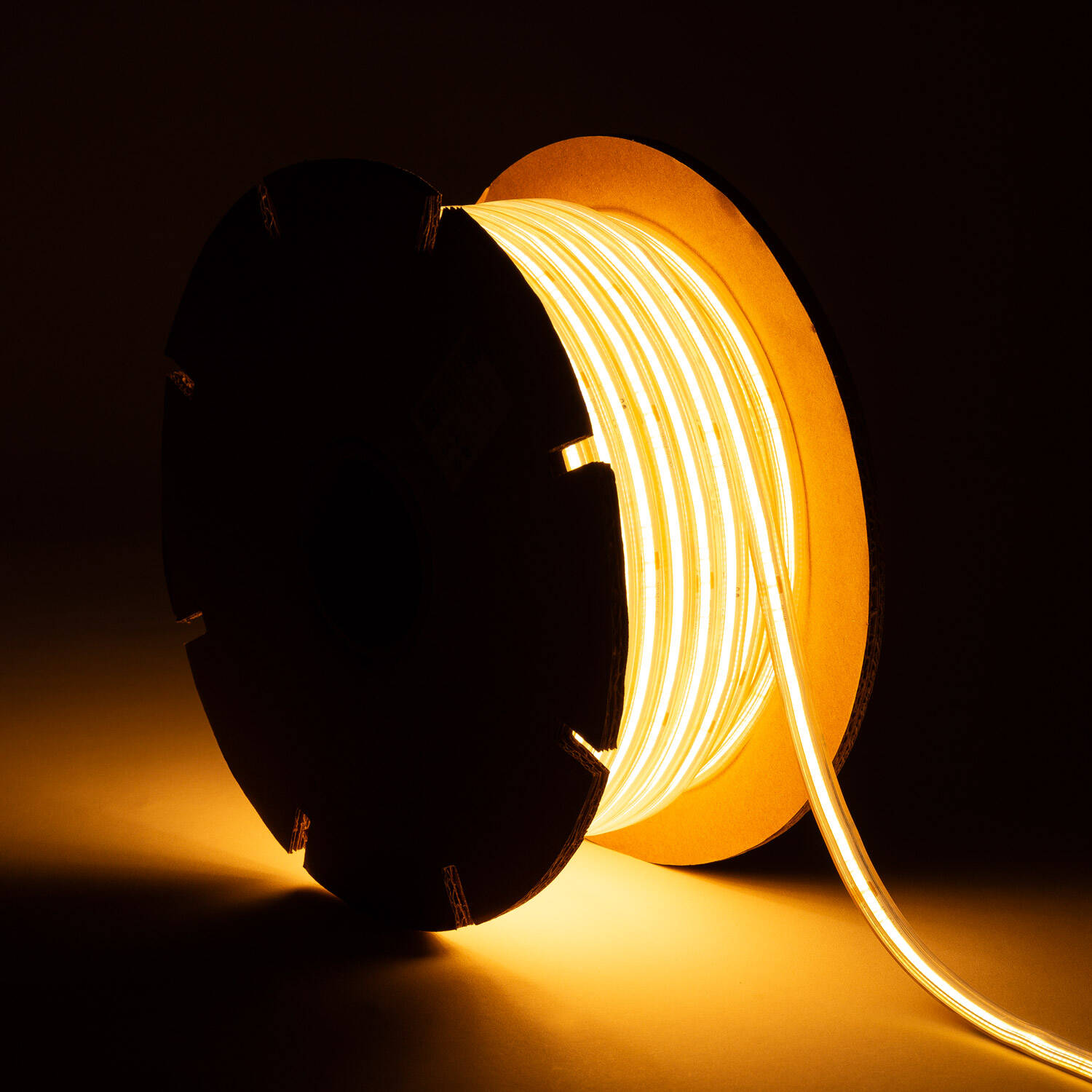 Ce ruban LED extérieur COB 220V dimmable en bobine de 50 m diffuse une lumière super chaude 2200K, continue et homogène, idéale pour souligner façades, terrasses ou contours architecturaux. Flexible, recoupable tous les 10 cm et protégé IP65, il se raccorde directement au secteur grâce au câble rectificateur inclus.