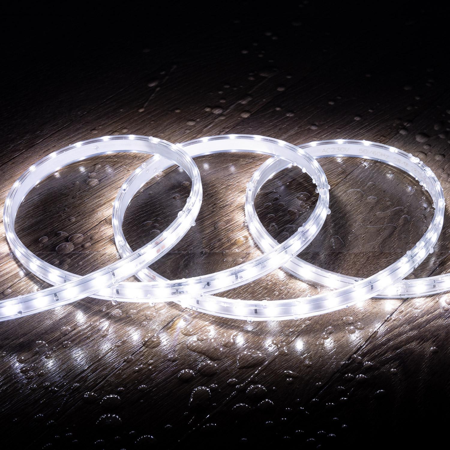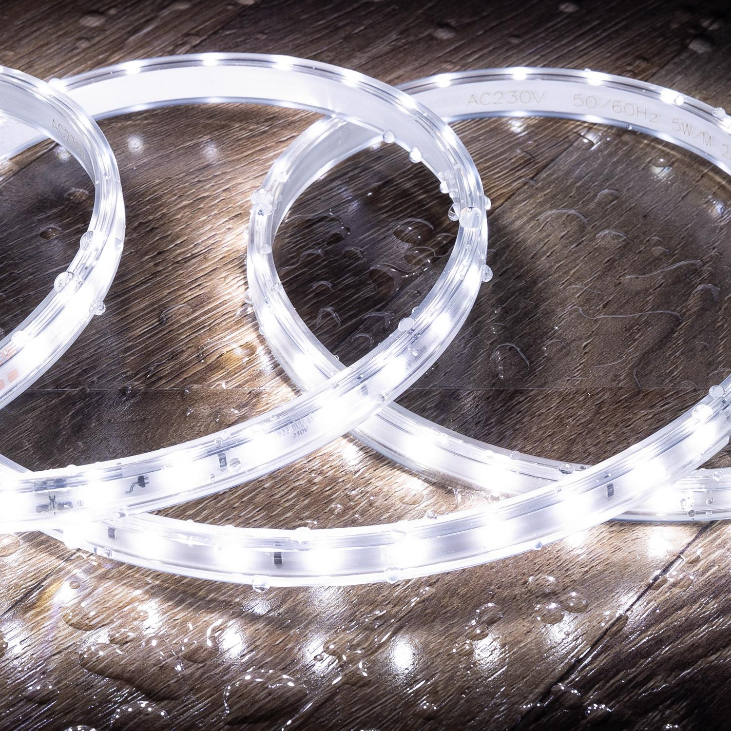 Ce ruban LED dimmable 220V de 10 m diffuse un blanc froid net, idéal pour l’éclairage extérieur décoratif ou fonctionnel des façades, terrasses, corniches et passages. Flexible, recoupable tous les 20 cm et protégé IP65, il se branche directement au secteur avec câble rectificateur inclus pour une installation simple.