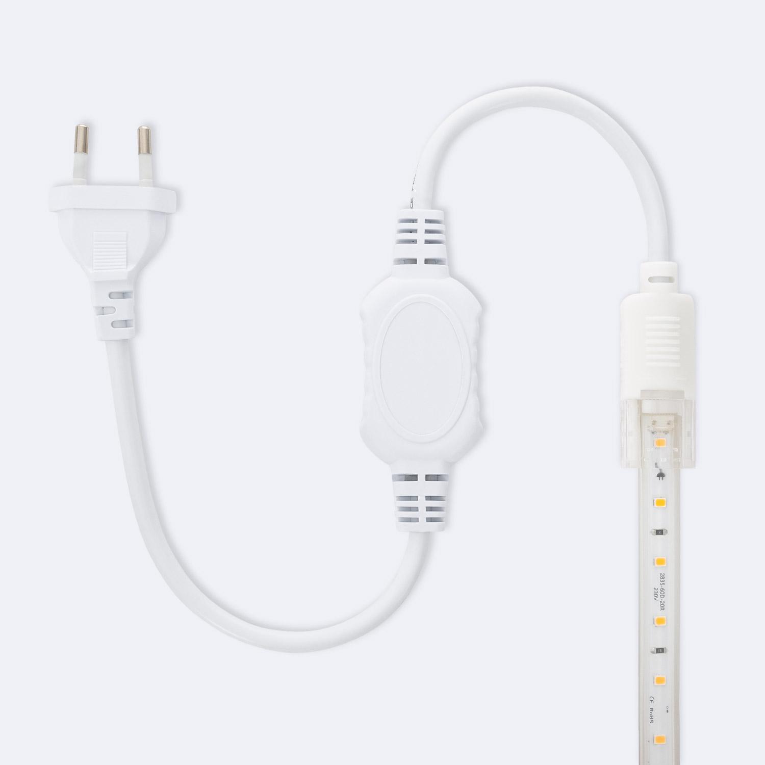 Le ruban est livré avec un câble rectificateur et une connexion prête à l'emploi visibles sur les images. La tension d'alimentation est 220-240V AC et la fréquence 50-60 Hz. Le produit est de classe d'isolation II et le driver est remplaçable si besoin. Pour des longueurs importantes respectez la limite d'installation indiquée et prévoyez des alimentations supplémentaires ou des points d'injection si nécessaire.