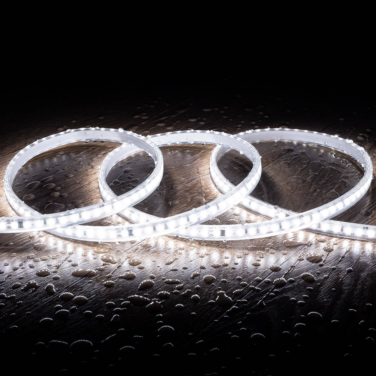 Ruban LED dimmable 220V sur mesure en blanc froid 6000K, idéal pour l’éclairage extérieur et décoratif. Son auto-redressement permet une connexion directe au réseau, sans alimentation supplémentaire, tandis que sa protection IP65 et sa coupe tous les 10 cm offrent une installation flexible sur façades, terrasses, vitrines ou passages.