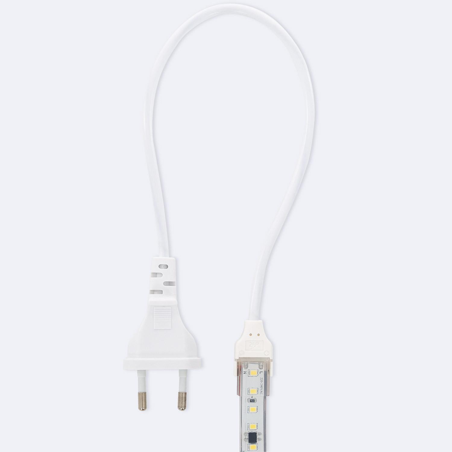 Ce ruban LED se connecte directement au réseau 220-240V AC et sur les photos on voit un câble secteur avec prise 220V fourni pour une mise en service simple. Pour une installation encastrée ou un raccordement permanent il est recommandé de faire appel à un électricien qualifié afin de respecter la sécurité électrique et la classe d'isolation II du produit.