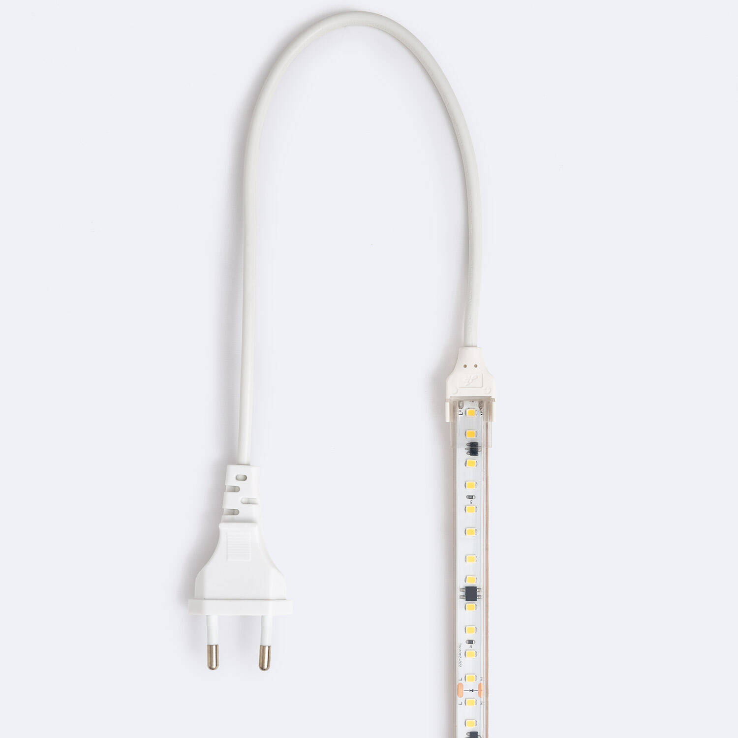 Ce ruban LED se branche directement au réseau 220-240V AC et fonctionne sans alimentation externe grâce à l'auto-redressement intégré. Les photos montrent le câble et la fiche pour branchement direct. Pour des installations fixes sur tableau électrique ou pour des longueurs proches de 50 m il est conseillé de faire intervenir un électricien afin de respecter les normes et la sécurité. Classe d'isolation II et fréquence 50-60 Hz.