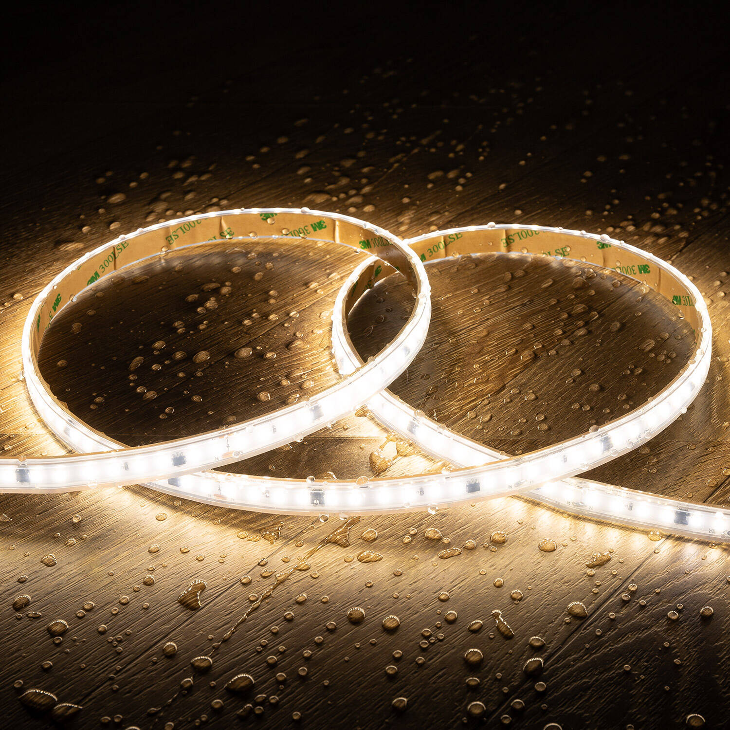 Ce ruban LED extérieur 220V dimmable de 3 m diffuse une lumière blanc neutre homogène et puissante, idéale pour terrasses, façades ou balisage décoratif. Son revêtement en silicone IP65, sa coupe tous les 10 cm et sa connexion directe au réseau assurent une installation souple, fiable et durable.