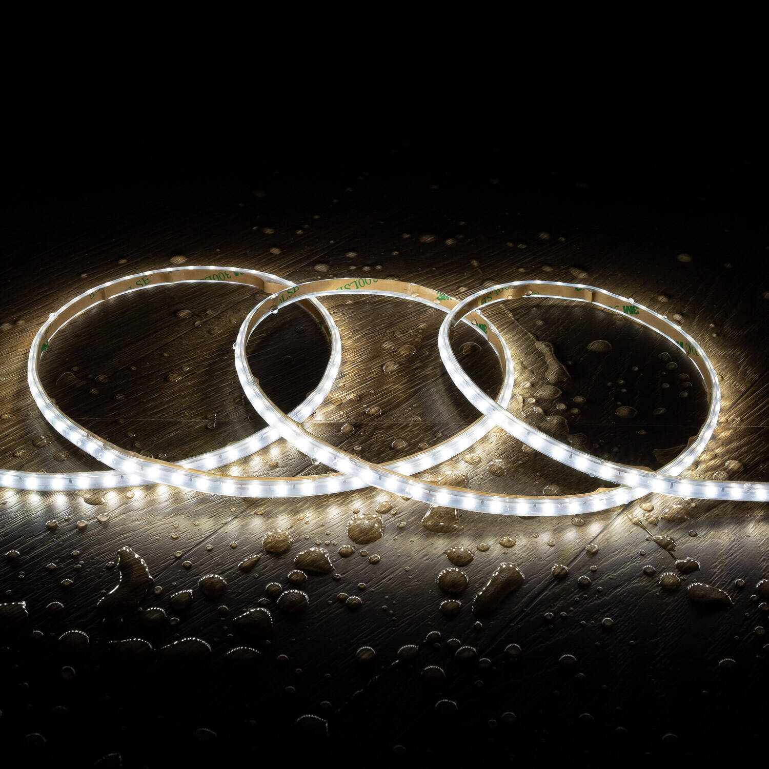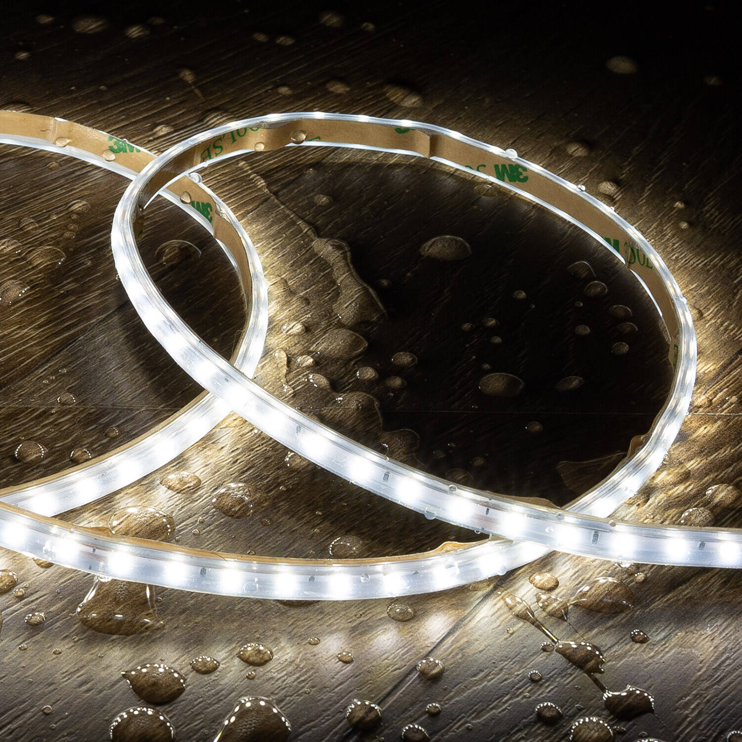Conçu pour l’extérieur, le ruban bénéficie d’une protection IP65 grâce à un enrobage en silicone sur support PCB, assurant résistance à la pluie et à la poussière. Il opère sur une plage de température de -20 °C à +50 °C, garantissant fiabilité même en conditions climatiques difficiles.