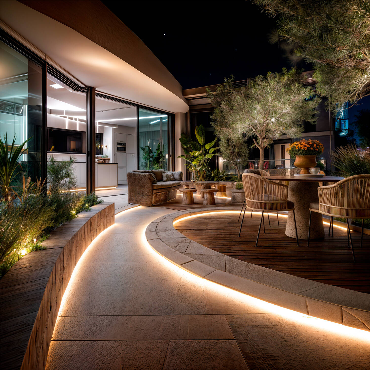Sa température de couleur blanc chaud (environ 3000K) et sa répartition circulaire à 360° créent un éclairage doux et continu sans points lumineux visibles. Idéal pour souligner contours, marches et mobilier extérieur tout en préservant une atmosphère élégante et accueillante.