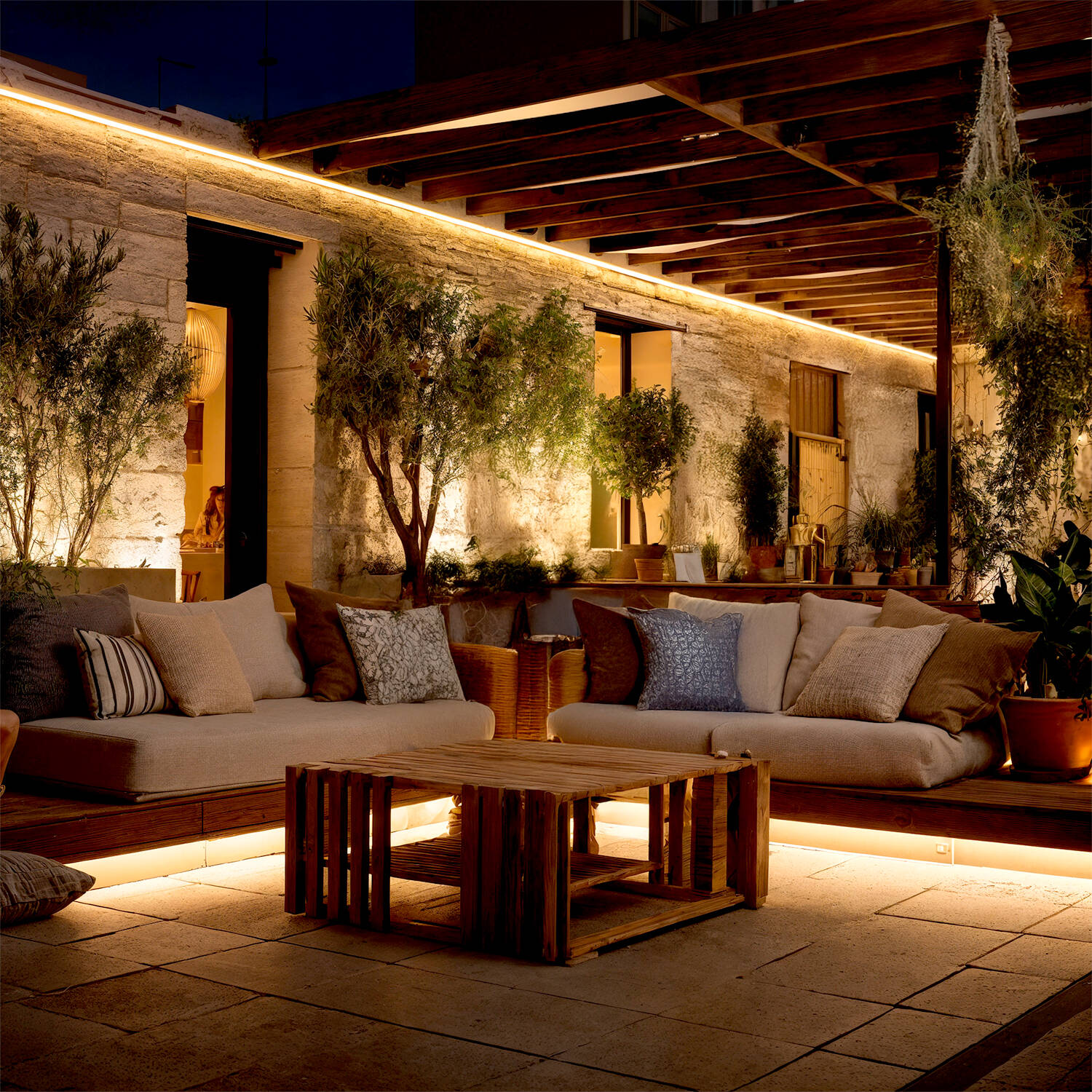 La forme semi-circulaire 180 offre un rendu continu type néon avec diffusion homogène grâce au profil PVC. Le ruban donne une lumière blanc chaud 3000K, environ 450 lm par mètre, avec 120 LED par mètre pour un éclairage décoratif et chaleureux idéal en extérieur et intérieur. Les dimensions compactes 15 mm de large sur 16 mm de haut facilitent l'intégration dans corniches et gouttières.