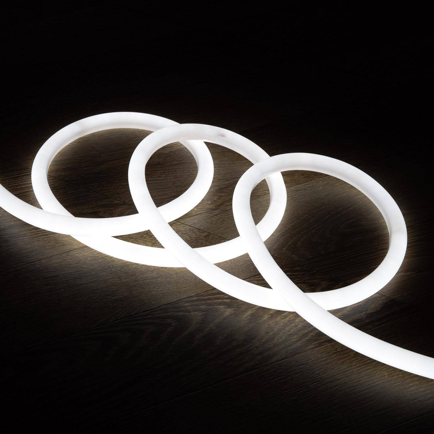 Ruban Néon LED Dimmable 220V, bobine de 50 mètres, conçu pour sublimer contours et volumes extérieurs tout en offrant une lumière blanc froid homogène. Sa gaine opale circulaire 360º diffuse un flux constant, idéal pour enseignes, terrasses et projets architecturaux exigeants.