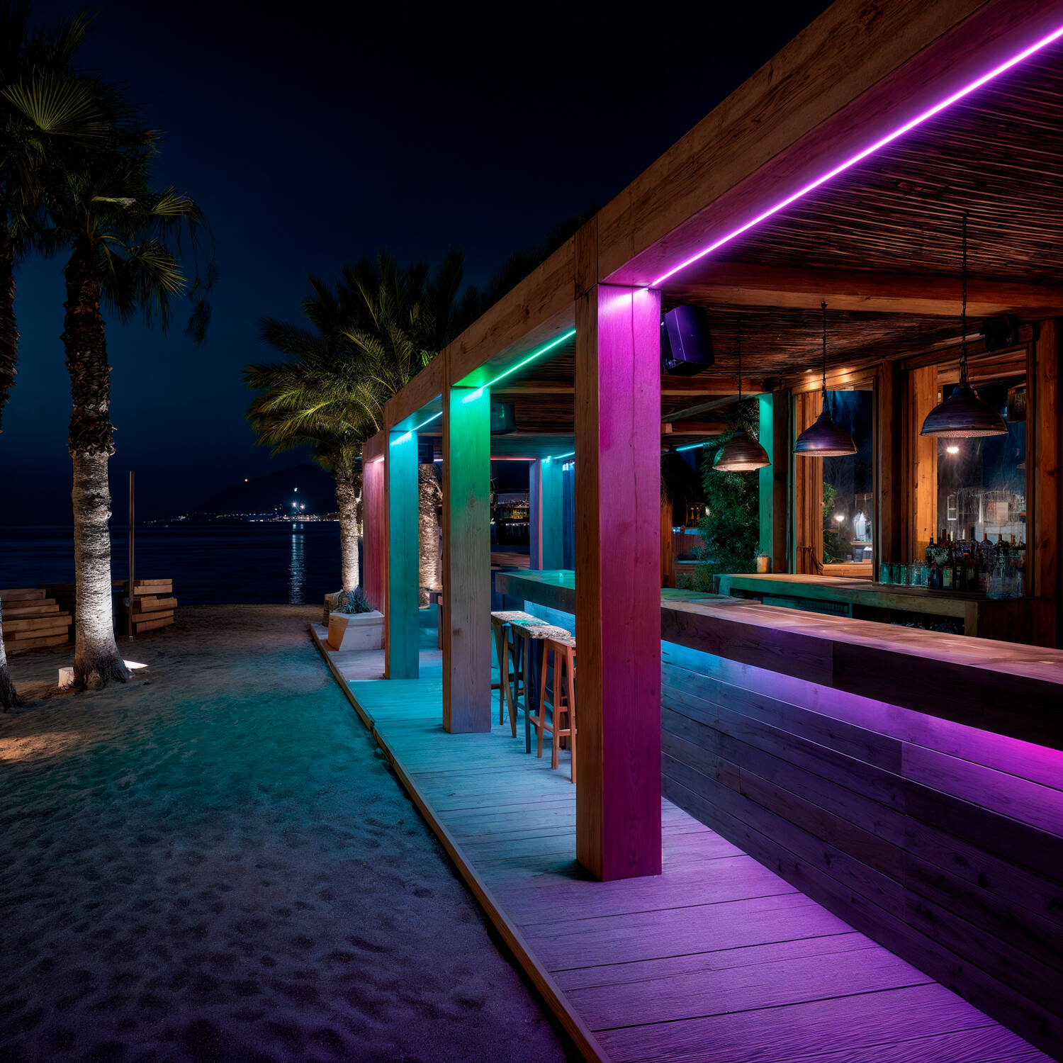 Parfait pour terrasses, pergolas, bars, enseignes ou projets architecturaux, ce ruban néon RGB apporte une touche contemporaine et raffinée. Sa finition opale diffuse une lueur douce et uniforme, sublimant les volumes tout en répondant aux exigences esthétiques des installations premium.