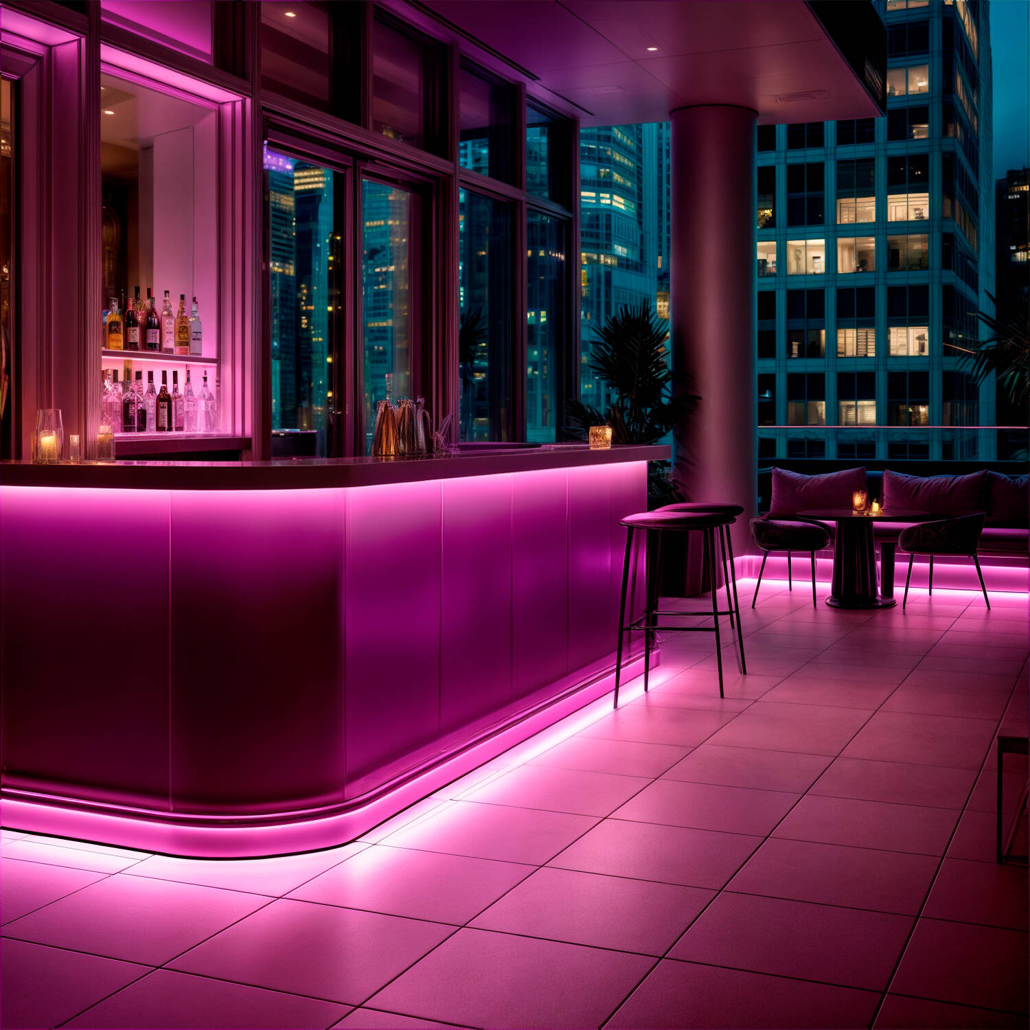 La gaine en PVC opale diffuse une lumière rose intense et homogène, mimant l’effet des néons classiques sans zones d’ombre. Avec 100 LED/m et des puces SMD2835, le rendu lumineux reste continu et raffiné, idéal pour habiller corniches, comptoirs ou lettrages avec un fort impact visuel.