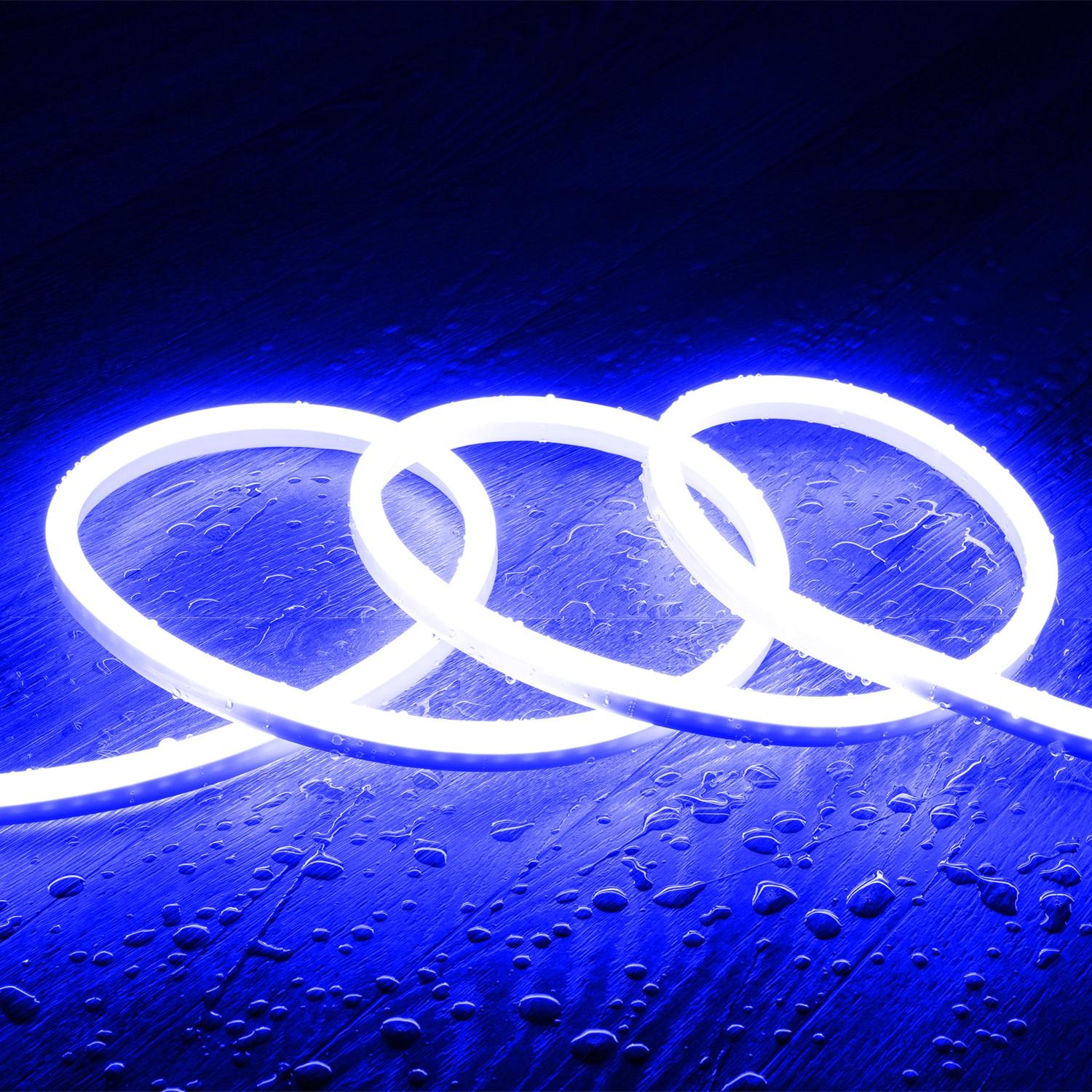 Sa finition opale et la densité de 120 LED par mètre garantissent un effet néon uniforme, sans points lumineux visibles. L’intensité chromatique du bleu, portée par des LED SMD2835, offre un rendu net tout en conservant la douceur visuelle recherchée pour enseignes et contours lumineux.