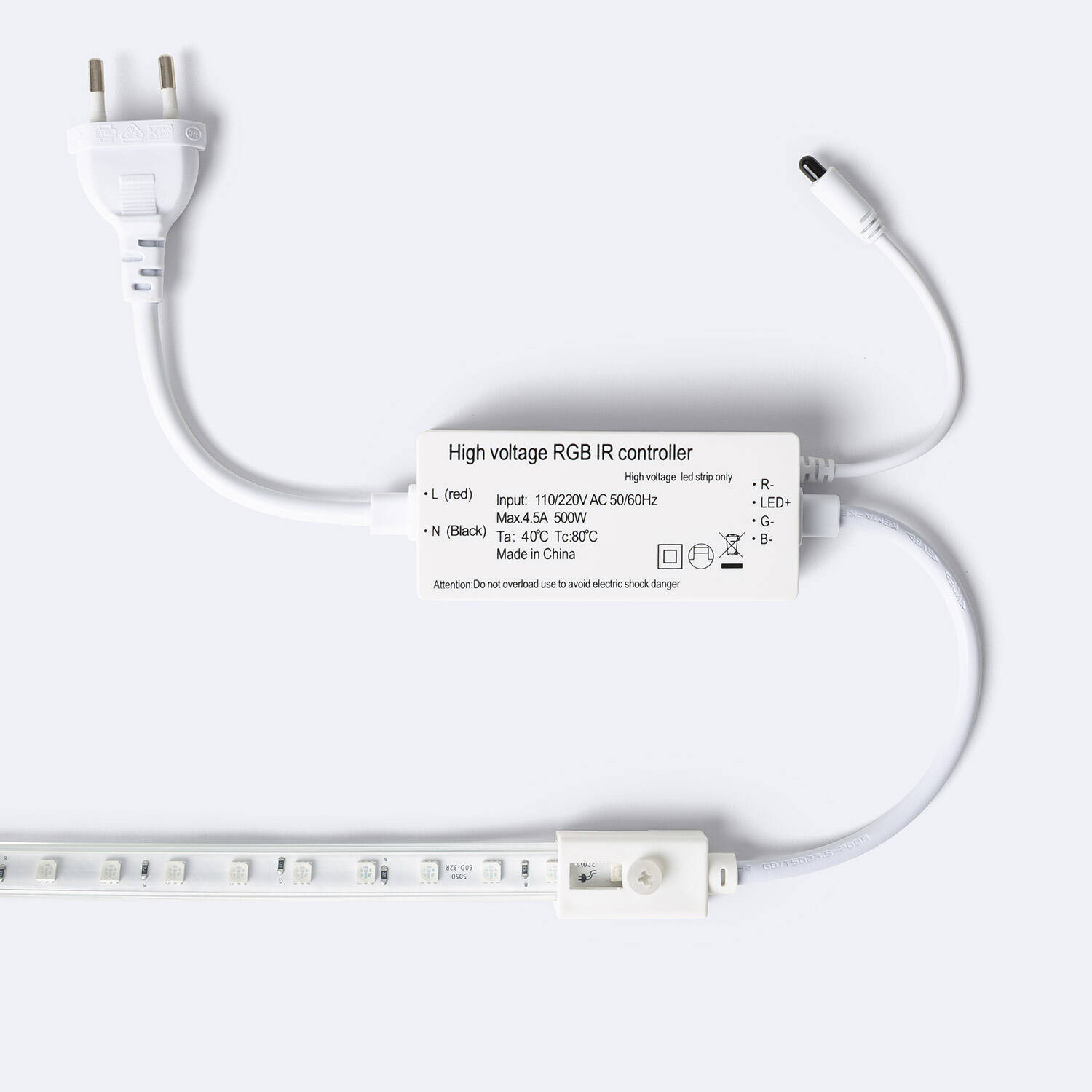 Ce Ruban LED RGB 220V se branche directement au secteur 220‑240V via le redresseur contrôleur fourni. Le ruban lui‑même est IP65 donc résiste aux projections d'eau, mais l'alimentation et le boîtier du contrôleur doivent être protégés de la pluie et des intempéries. Pour une installation sécurisée et conforme, il est recommandé de faire intervenir un électricien pour les branchements fixes.