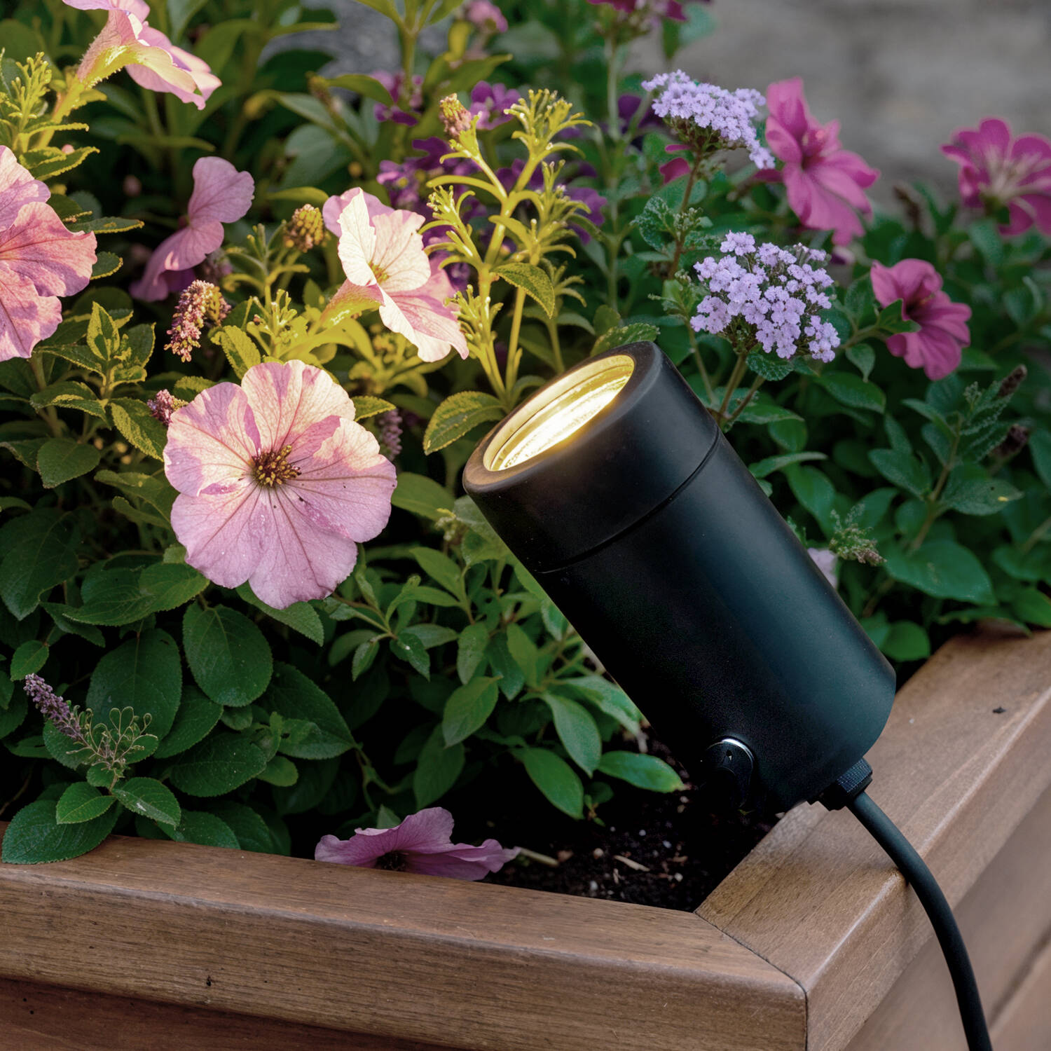 Le corps du spot est réglable grâce à son support orientable, ce qui permet de diriger précisément le faisceau pour mettre en valeur plantes, allées ou façades. Grâce à la douille GU10 vous pouvez choisir une ampoule LED au faisceau adapté pour un éclairage d'accent ou d'ambiance extérieur.