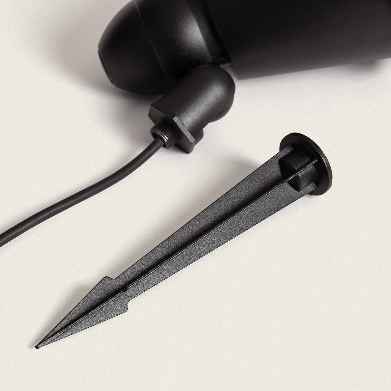 Le spot est livré avec une pointe conçue pour l'enfoncer dans le sol. Plantez la pointe dans une terre ferme, positionnez le projecteur puis orientez la tête selon vos besoins. Pour sol très dur, mur ou terrasse, prévoyez une platine de fixation adaptée non fournie et faites appel à un professionnel si nécessaire.