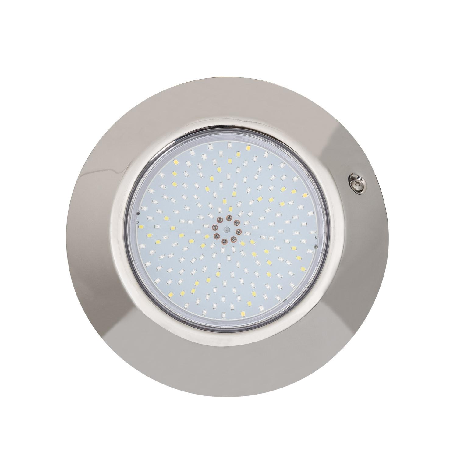 Ce spot LED piscine en saillie RGBW submersible 12V DC crée une mise en lumière décorative et polyvalente pour piscine, fontaine ou bassin. Son corps en acier inoxydable 316L et sa protection IP68 assurent une excellente résistance en immersion. Installation en surface, pilotage par contrôleur RGBW non inclus, transformateur 12V DC requis.