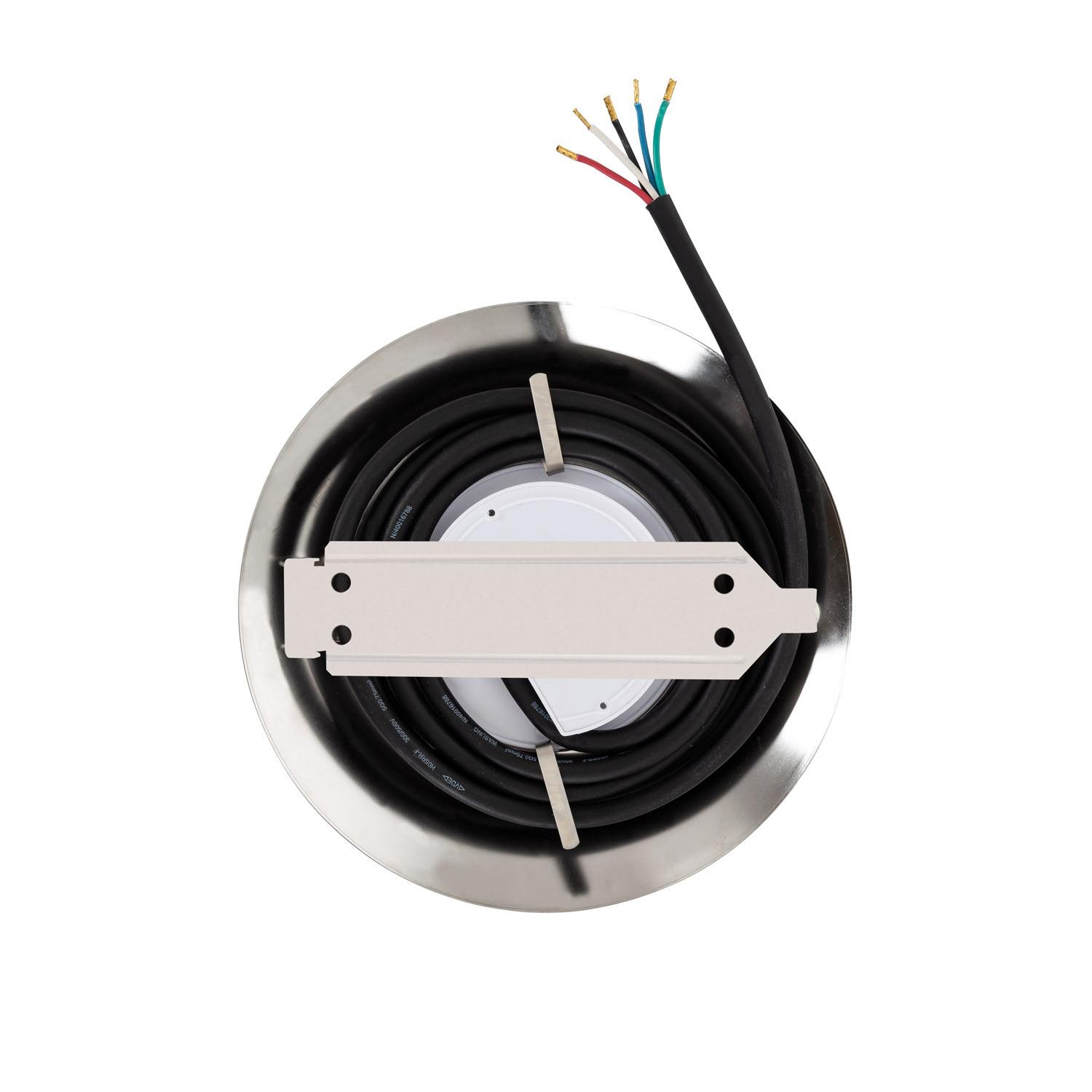 L’installation en surface s’effectue à basse tension 12V DC; un transformateur adapté est nécessaire (non inclus). Le spot arrive pré‑câblé avec environ deux mètres de câble et se commande via un contrôleur RGBW (5 fils non fournis). Ne pas tester hors de l’eau plus de dix secondes.