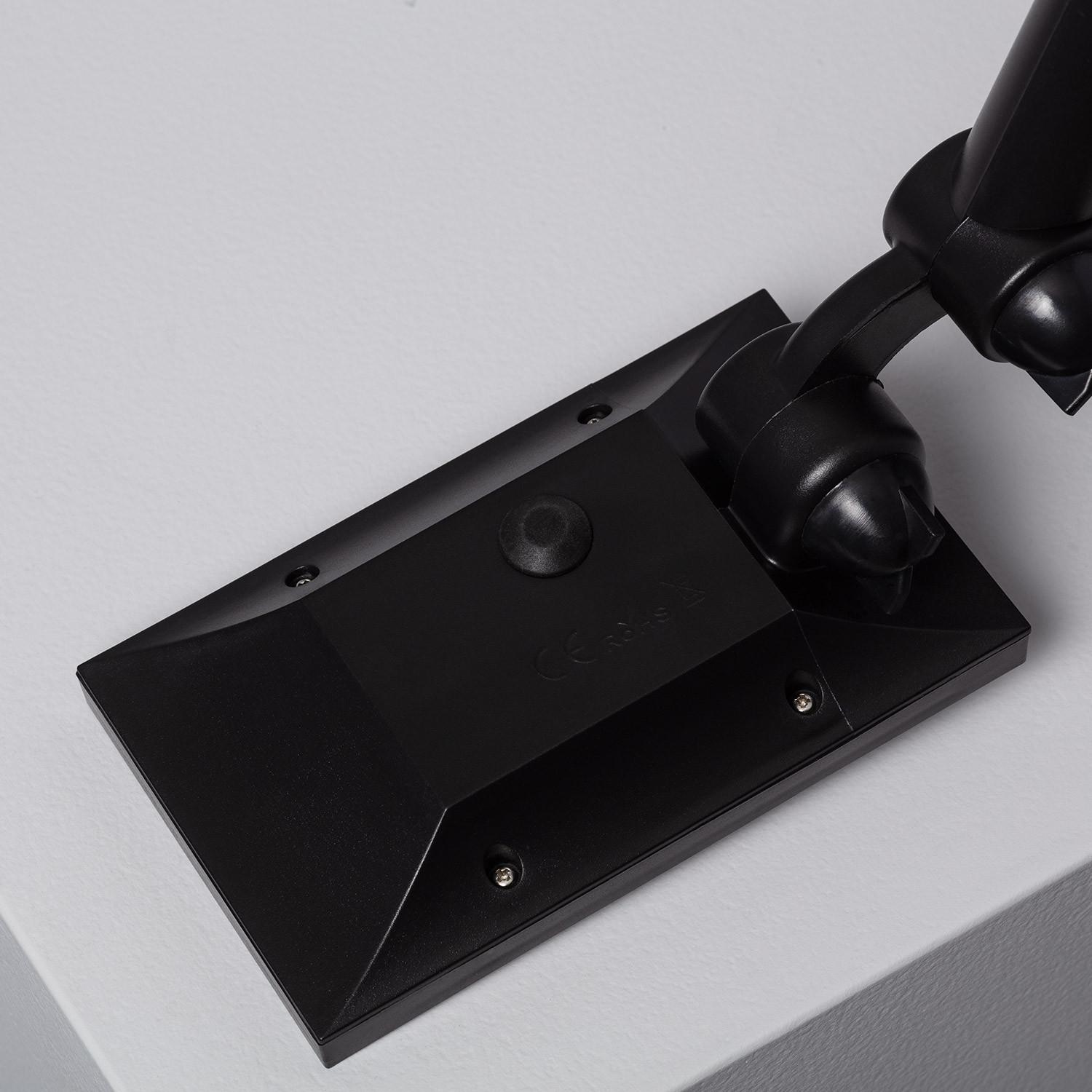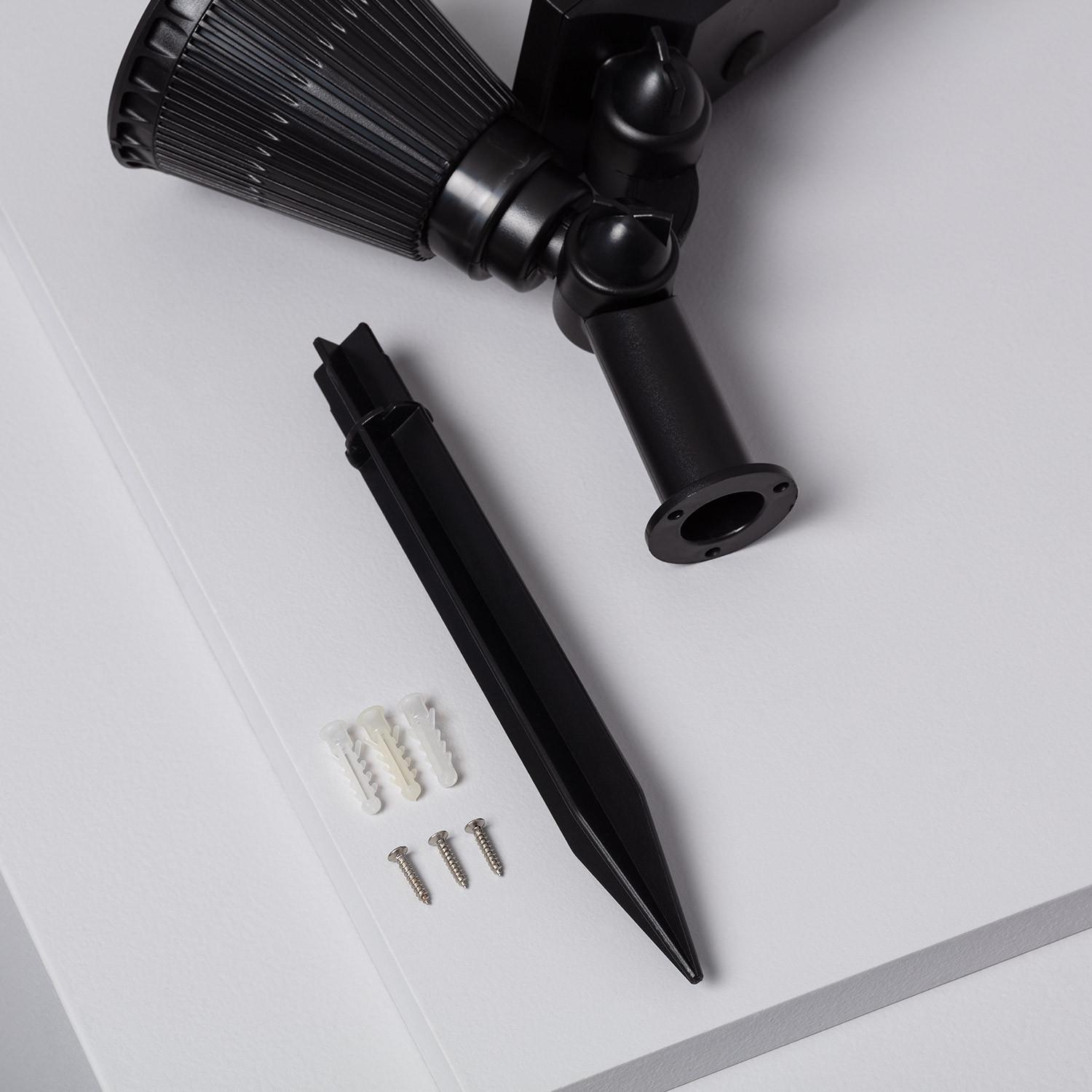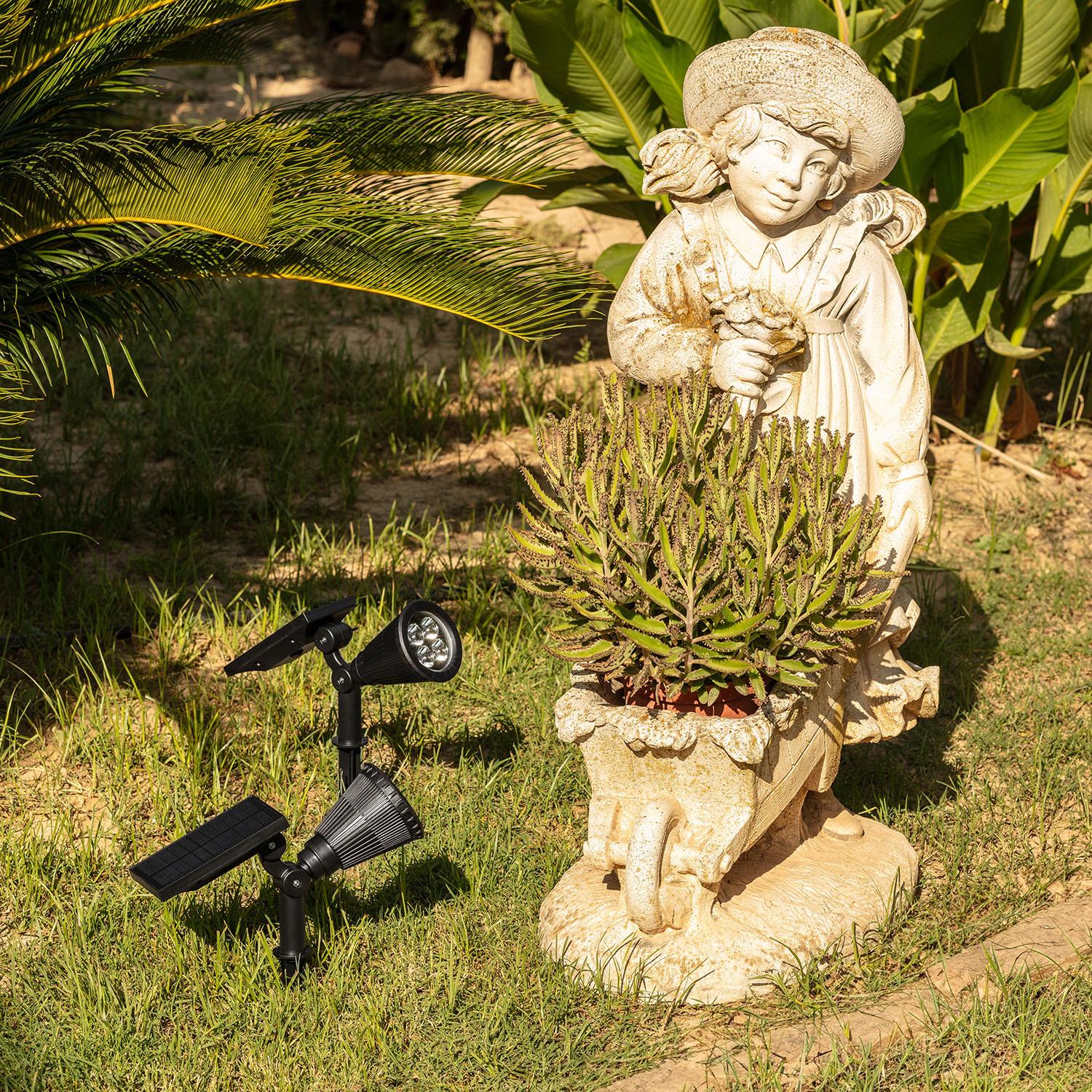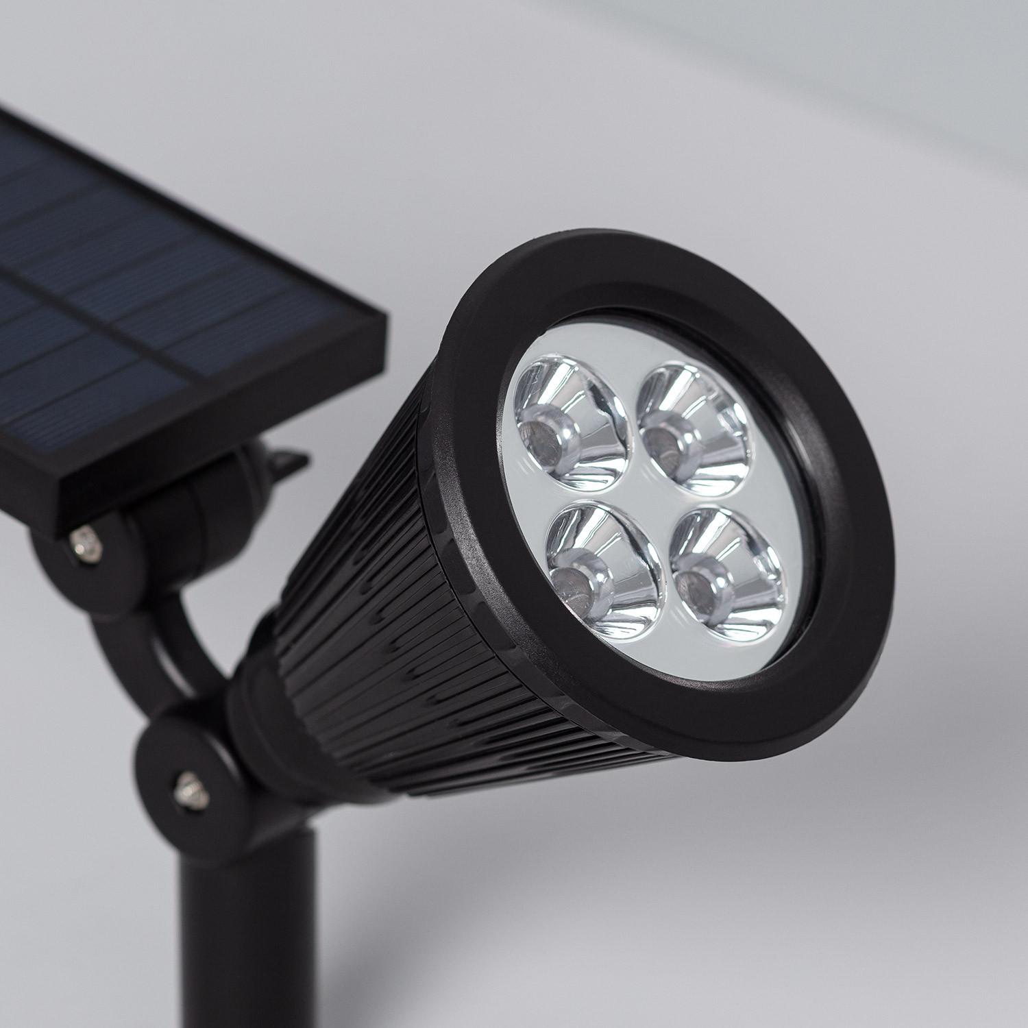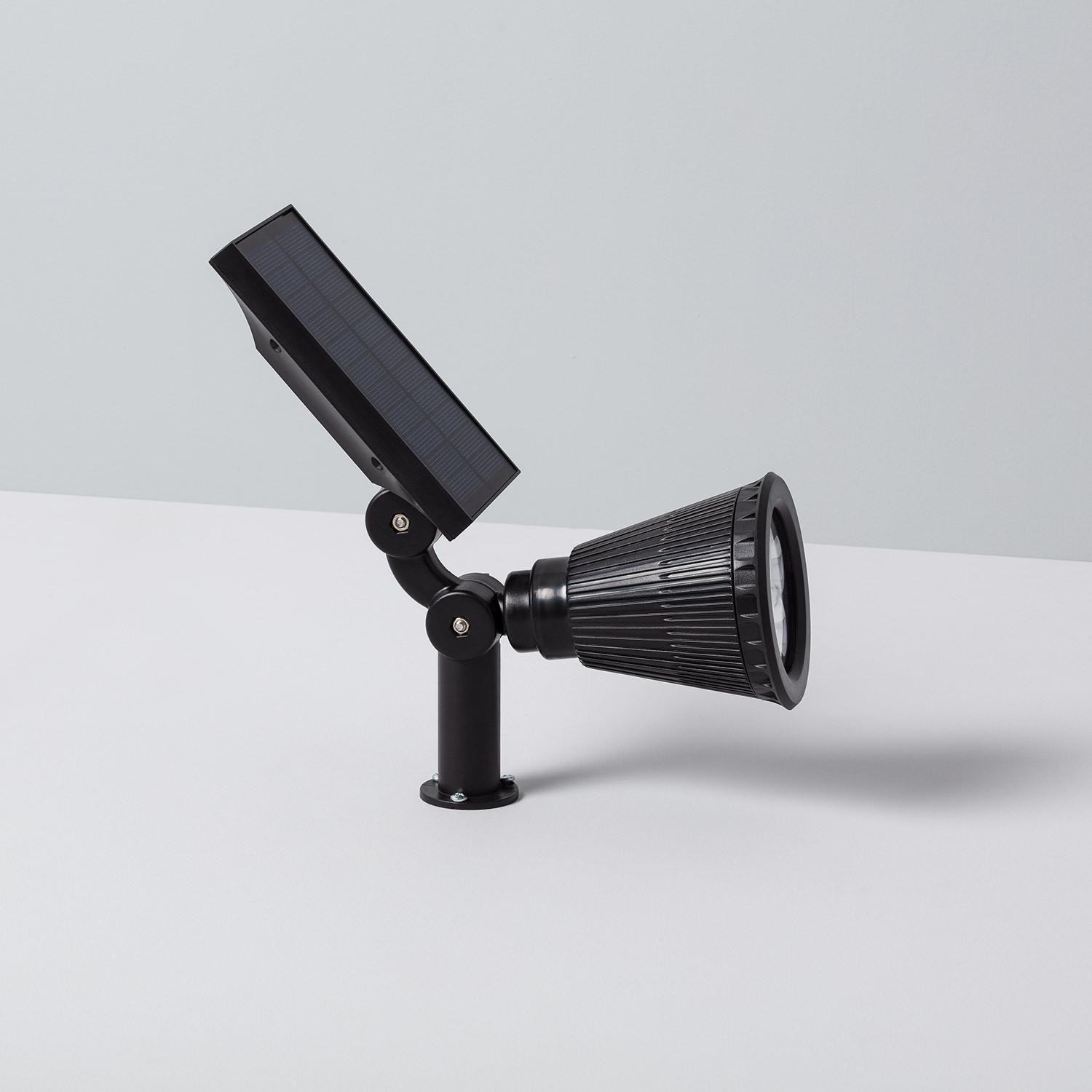 Le spot est conçu pour être planté en terre grâce à la pointe fournie. Enfoncez la pointe dans un sol meuble, ajustez l'orientation du panneau solaire et de la tête via les articulations visibles pour viser la zone à éclairer, puis assurez-vous que le panneau reçoit un bon ensoleillement. Pour un sol très dur, ameublissez la terre ou creusez un trou guide avant d'enfoncer la pointe.