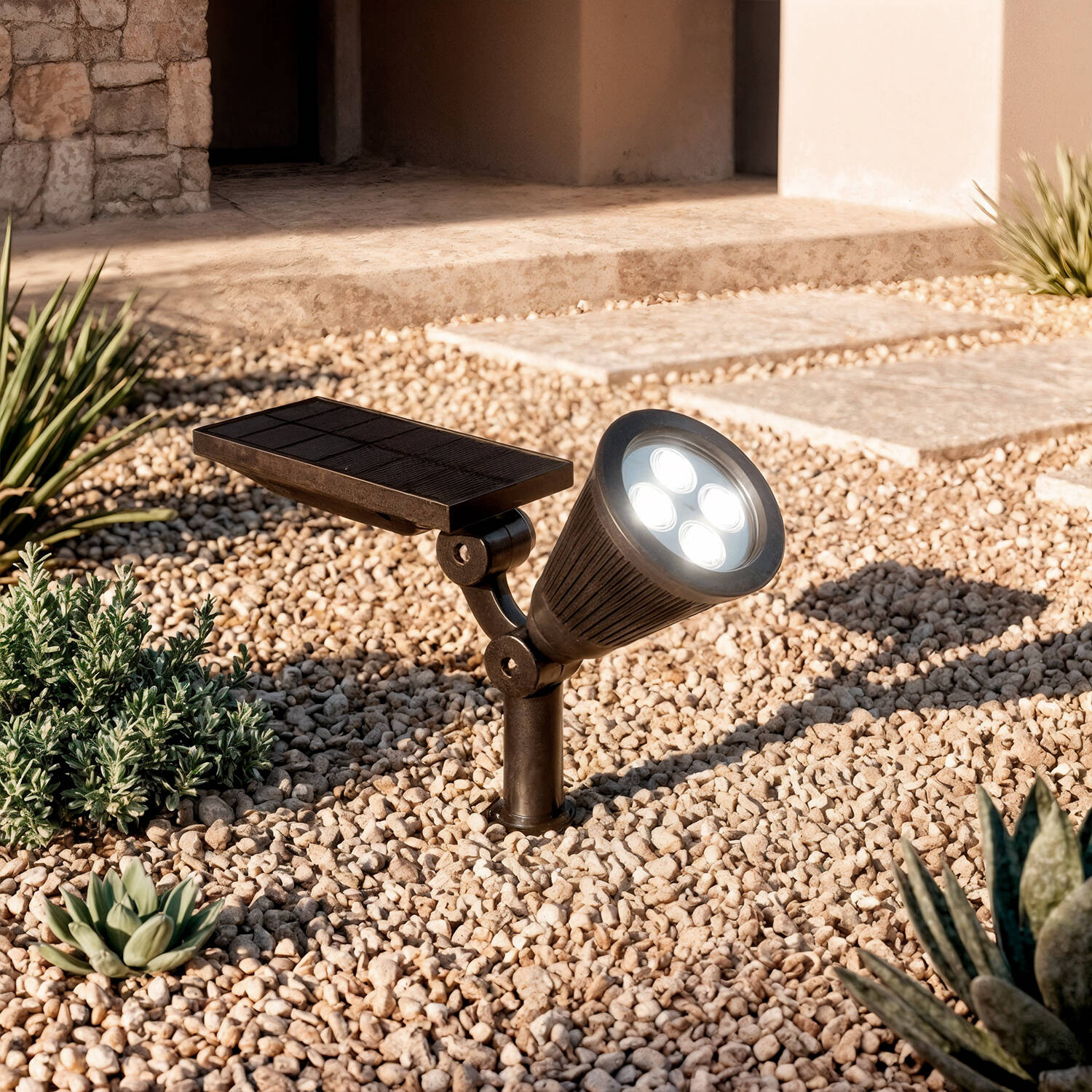 Le Spot LED Solaire Meillion délivre 200 lm en blanc neutre 4000K avec 4 LED et une puissance de 2 W, ce qui convient parfaitement pour l'éclairage de chemins, la mise en valeur de massifs ou l'éclairage d'accentuation. C'est un point lumineux unique efficace pour créer un éclairage sécurisant et esthétique en extérieur.