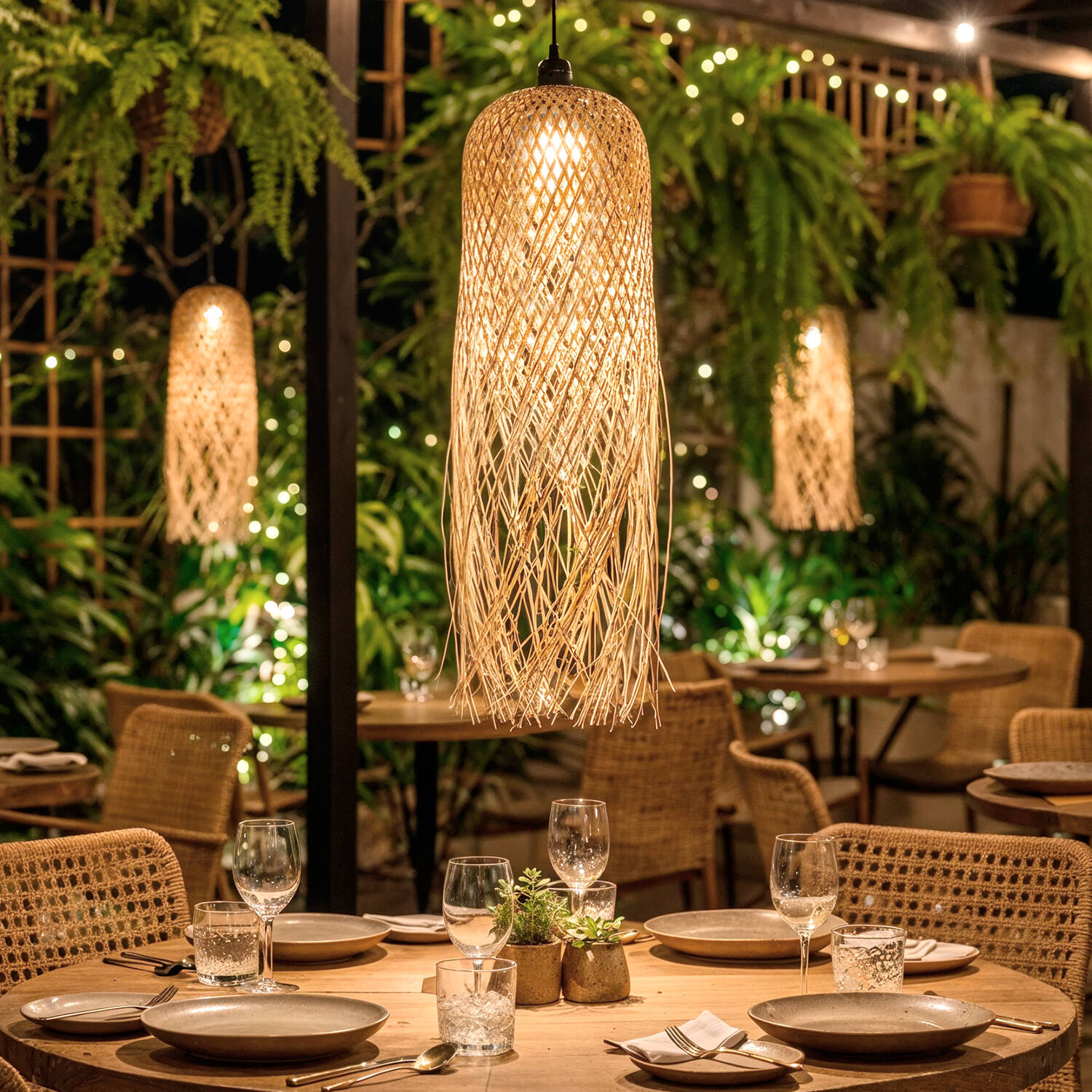 Le tressage fin du bambou crée un jeu d’ombres délicat qui sublime chaque repas ou moment partagé. Sa teinte naturelle s’harmonise avec des décors méditerranéens, tropicaux ou boho, offrant une touche artisanale et sophistiquée sans dominer l’ambiance visuelle de votre espace extérieur.