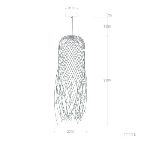 Le diffuseur a un diamètre de 200 mm et la suspension descend jusqu'à 2100 mm hors réglage du câble. Pour un éclairage d'ambiance au dessus d'une table à manger, il est courant de positionner la base de la suspension à environ 60 à 75 cm au dessus du plateau pour un éclairage optimal sans éblouissement.