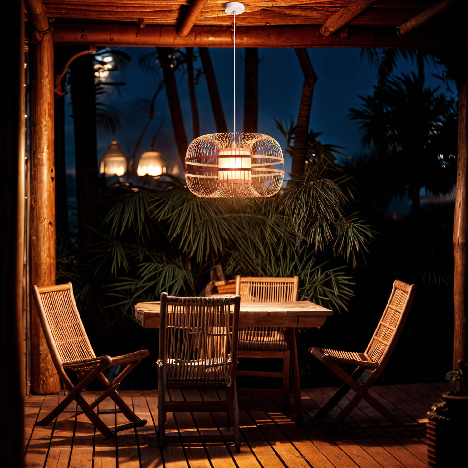 La Suspension Bambou Extérieure Ofelia apporte une touche naturelle et boho chic à une terrasse, une pergola ou un coin repas extérieur. Son abat-jour ajouré en bambou diffuse une lumière chaleureuse et décorative, tandis que sa protection IP65 convient à l’usage extérieur. Fonctionne avec 1 ampoule E27 non incluse.