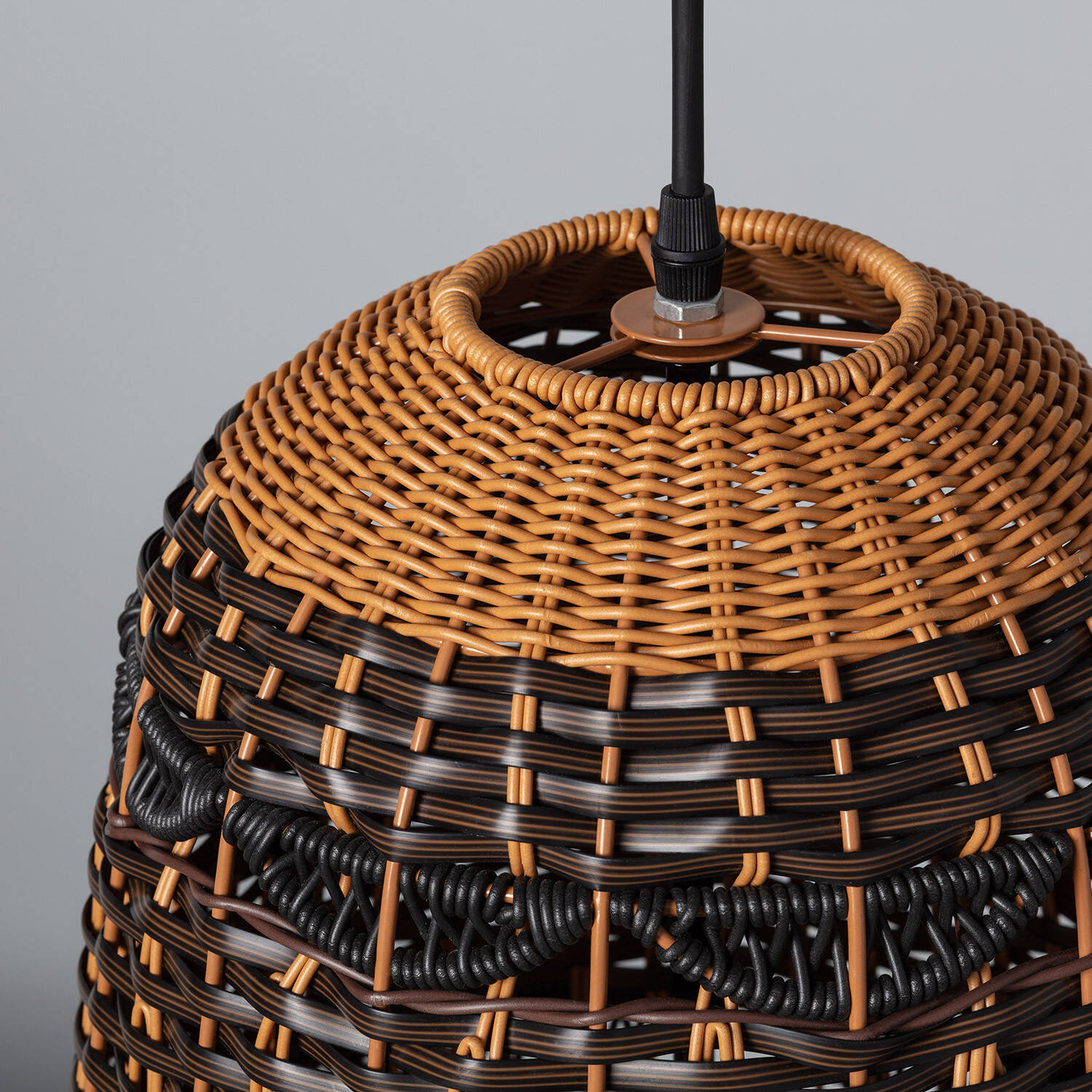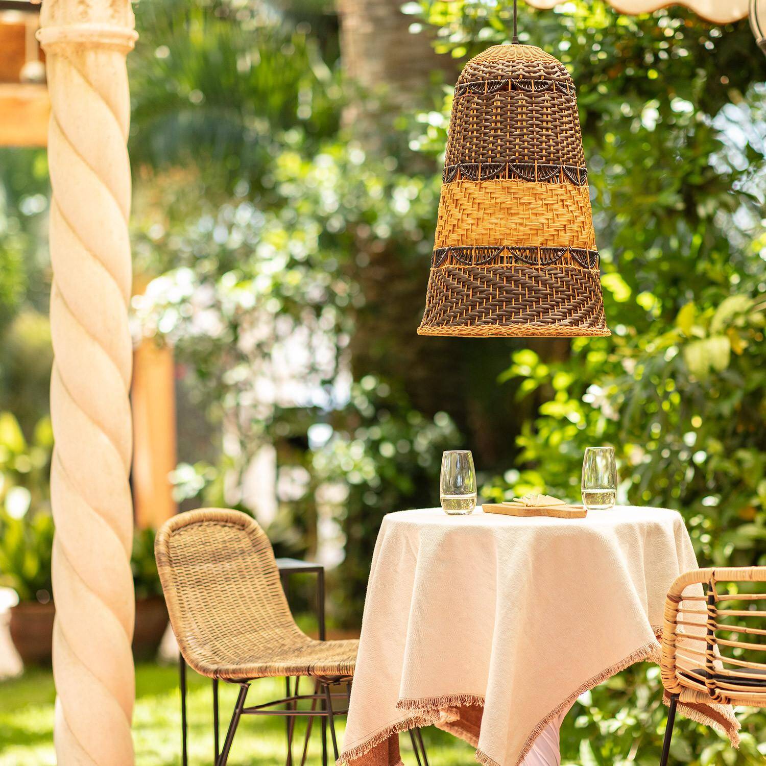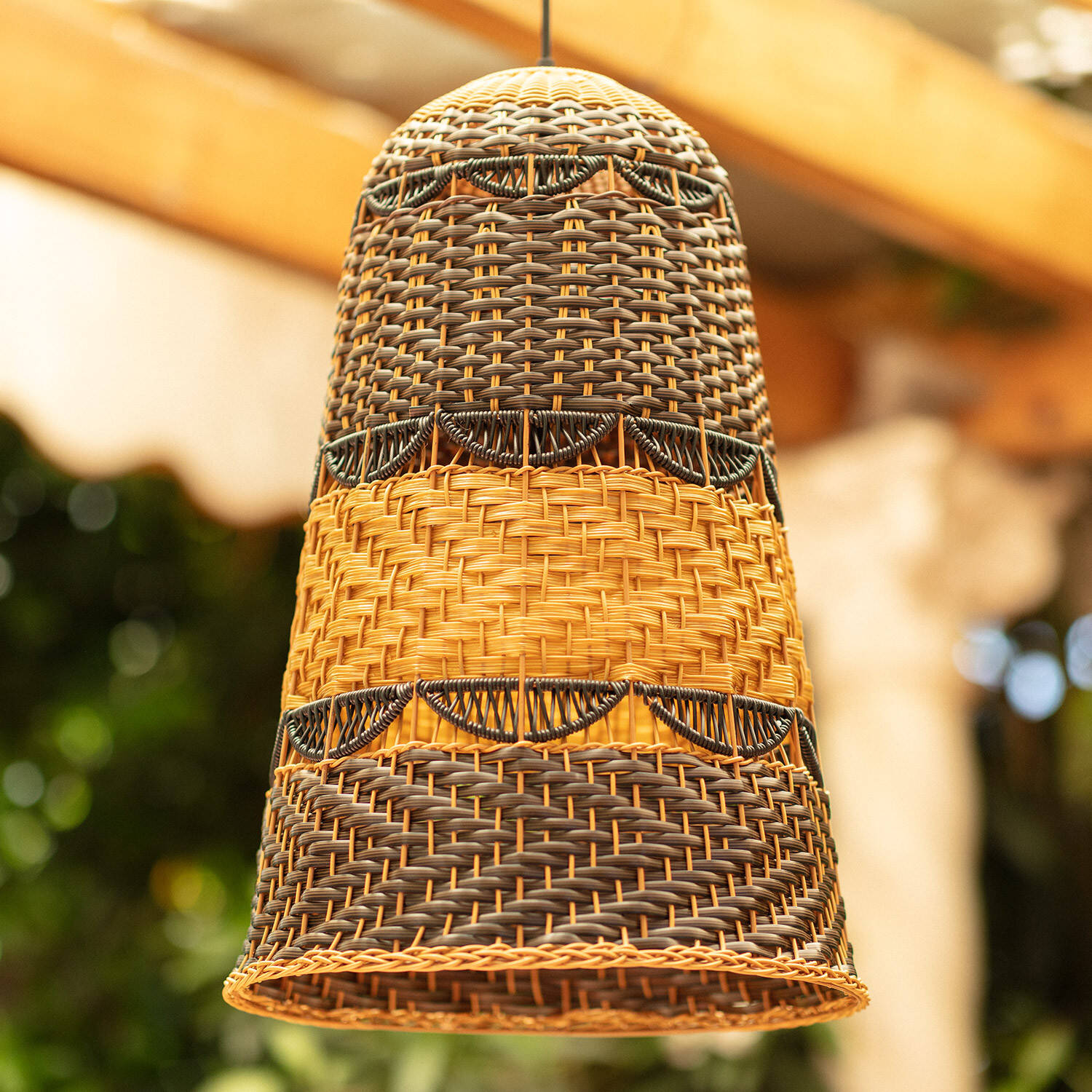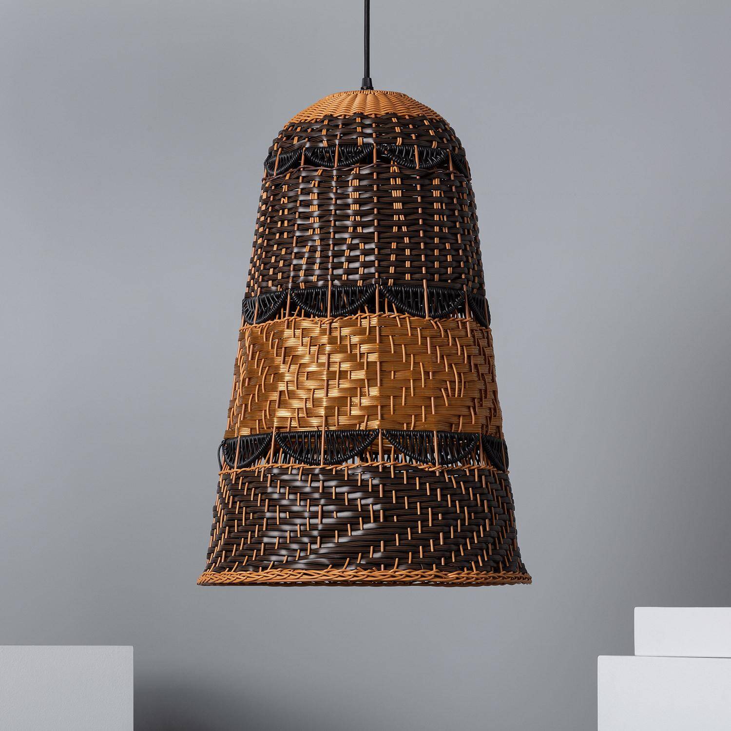 La Suspension Extérieure Torcelo apporte une ambiance chaleureuse et naturelle à vos espaces extérieurs comme intérieurs. Son abat-jour en rotin synthétique tressé, aux tons contrastés, diffuse une lumière douce et décorative idéale pour terrasse, pergola ou coin repas. Compatible avec une ampoule E27 non incluse et conçue pour un usage extérieur IP44.